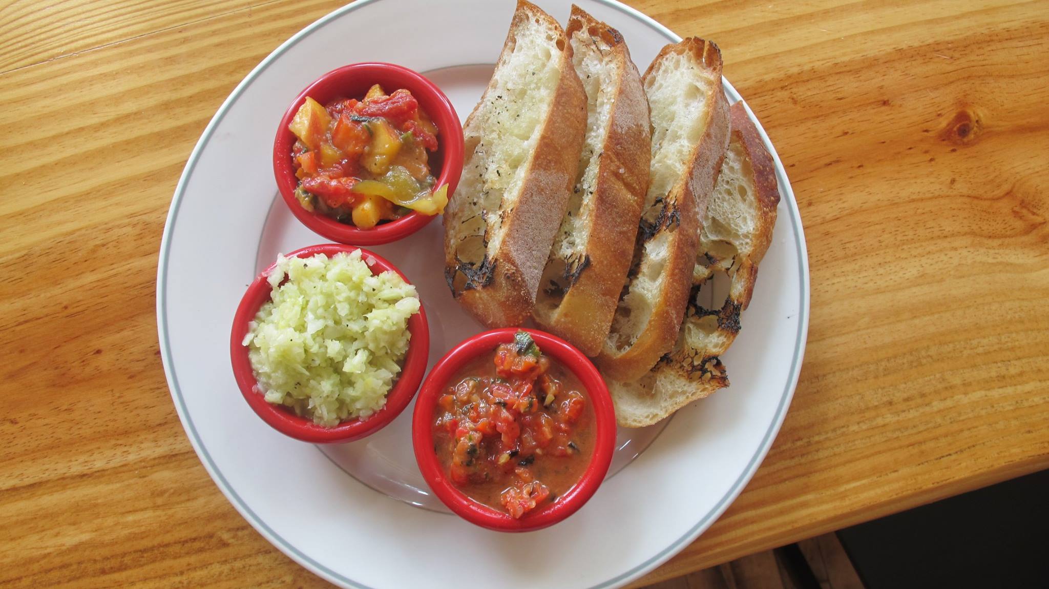 Try the Bruschetta Trio: three types of bruschetta (tomato basil, peach/red pepper, and celery/lime) served with grilled baguette slices, the avocado toast (toast covered in avocado, tomato, cucumber and fresh herbs) for $5, the Strawberry Shortcake Pancakes (2 huge pancakes served with fresh strawberry compote and coconut whip) – with or without real maple syrup for $11, or one of their newest offerings: Swiss Chard Enchiladas with a filling of sweet potato, kale and roasted pepitas topped with enchiladas sauce.