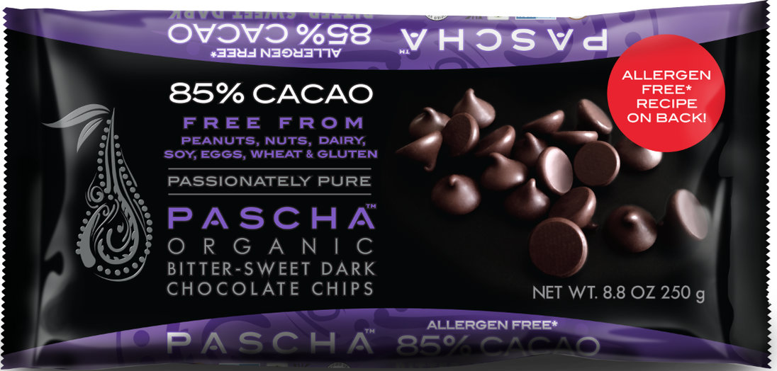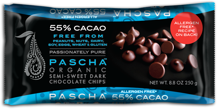 Pascha Organic Chocolate Chips are the ultimate in chocolate chips: pure chocolate bliss made with organic cocoa mass, organic sugar, organic cocoa butter, and organic vanilla. Free from dairy, egg, soy, wheat, gluten, peanuts, and nuts, these chocolate chips are non-GMO verified, certified organic, vegan, and fair-trade, or in simpler terms: passionately pure and allergen free.