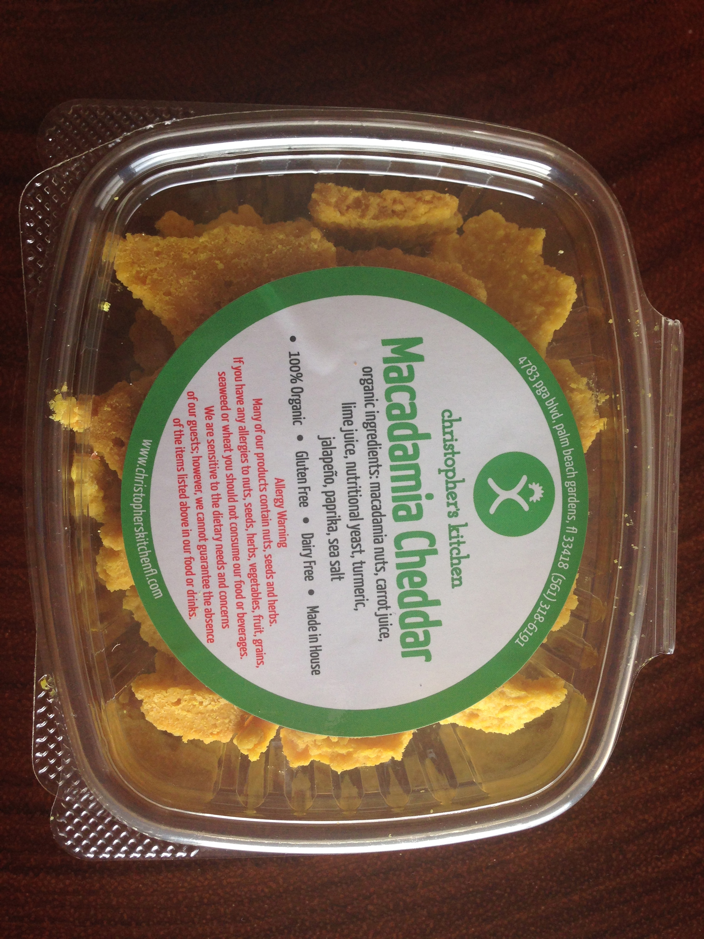 There are several companies making vegan cheeses but no one makes a product like Macadamia Cheddar which can only be purchased from Christopher’s Kitchen at 4783 PGA Boulevard in Palm Beach Gardens, Florida. At $7.75 for a 4 ounce container, Macadamia Cheddar is expensive but worth every bite!