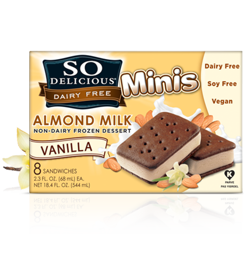 So Delicious Dairy Free vanilla sandwiches are called “minis.” At 2.3 ounces each, the frozen dessert (technically, this treat cannot be called “ice cream” being dairy-free) is the perfect size for a snack or dessert any time of the year.