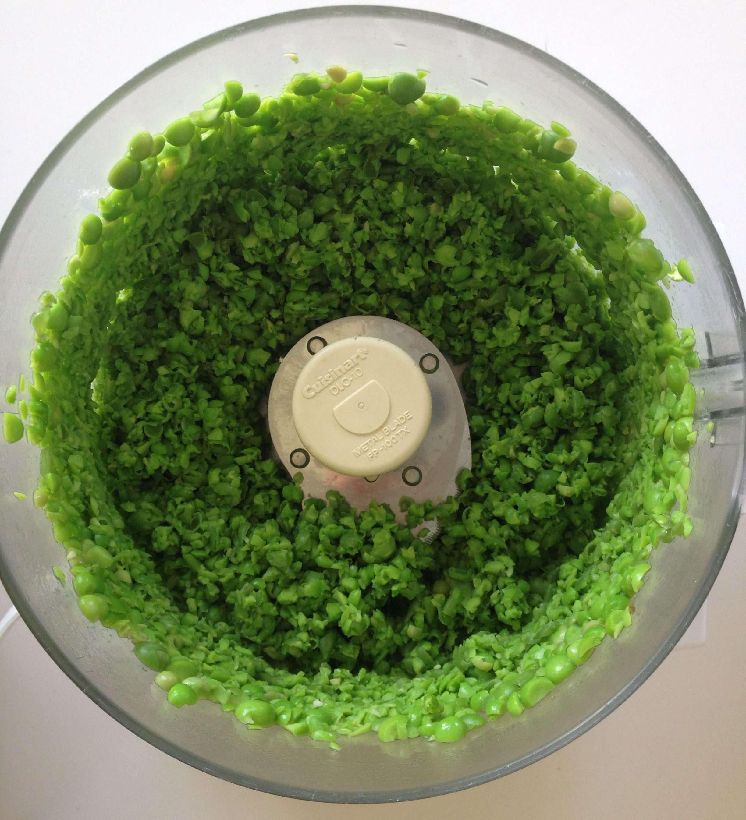 - Bring a medium pot of water to a boil. Drop the fresh peas in for 60 seconds. Remove, drain and place the peas in a food processor. Pulse the peas about 10-12 times until the peas are chopped but not mushy.