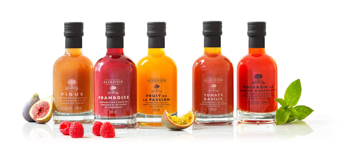 France’s oldest (1822) oil and condiment makers – A L’OLIVIER – makes 7 fruit vinegars – Passion Fruit, Mango, Raspberry, Fig, Black Currant, Tomato, and Espelette Chili Pepper (a red pepper grown in the Basque region) – that make a refreshing addition to summer salads. With a thick sauce-like texture and a fruity-tart sweetness, the natural bright-colored A L’OLIVIER fruit vinegars are smooth and delicious as is – or as the perfect addition to olive oil for a light summer dressing.