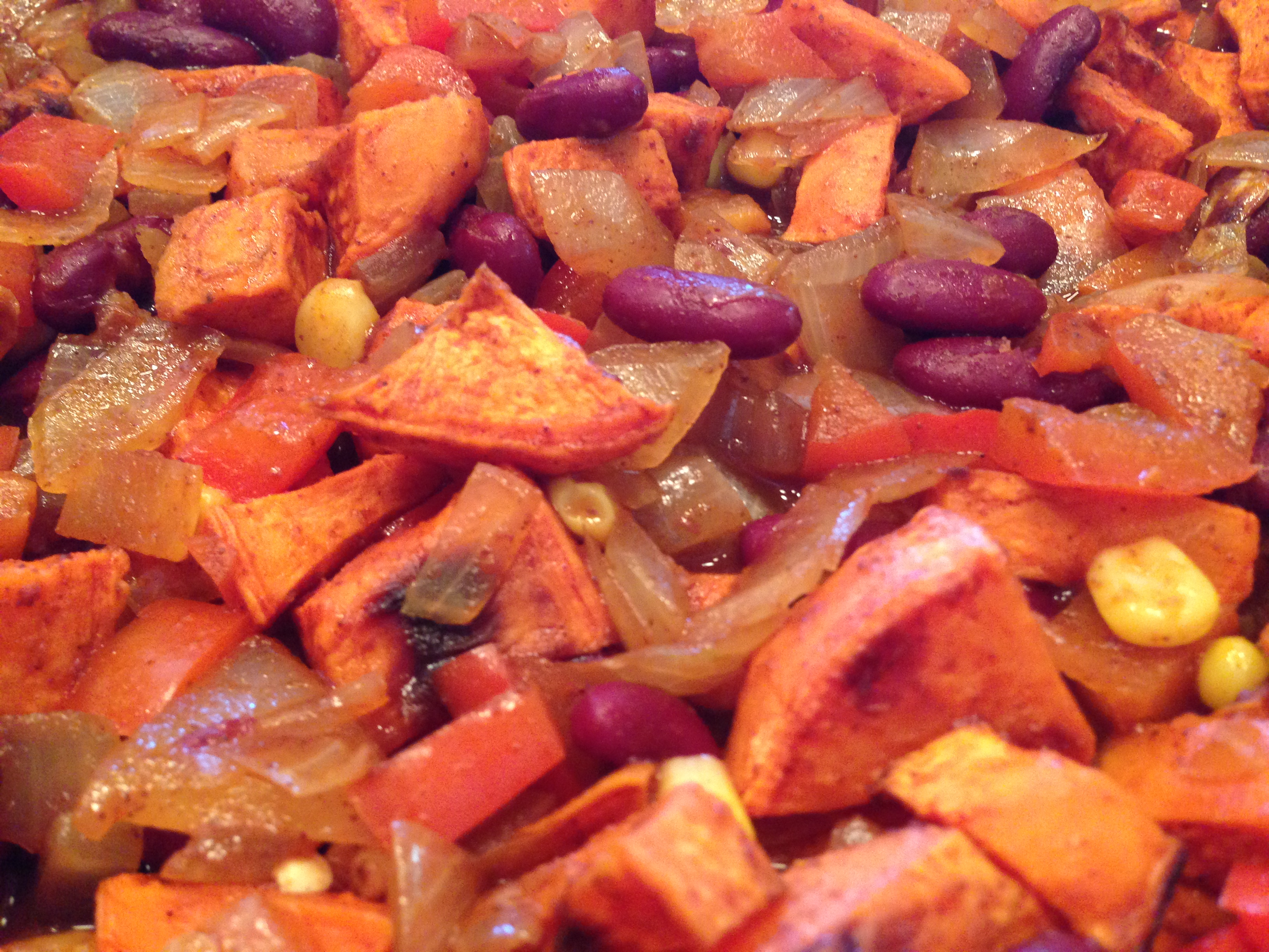 Meanwhile, place 1 teaspoon of grapeseed oil in a large skillet on medium heat. Add the chopped onion and red pepper and cook, stirring frequently, for 5-7 minutes until the onion is translucent. Push the garlic clove through a garlic press and add to the onion/pepper mixture and stir to distribute, cooking for a minute. Add the kidney beans, corn, and cooked sweet potato pieces and cook 2-3 minutes to heat through. Turn the heat off.