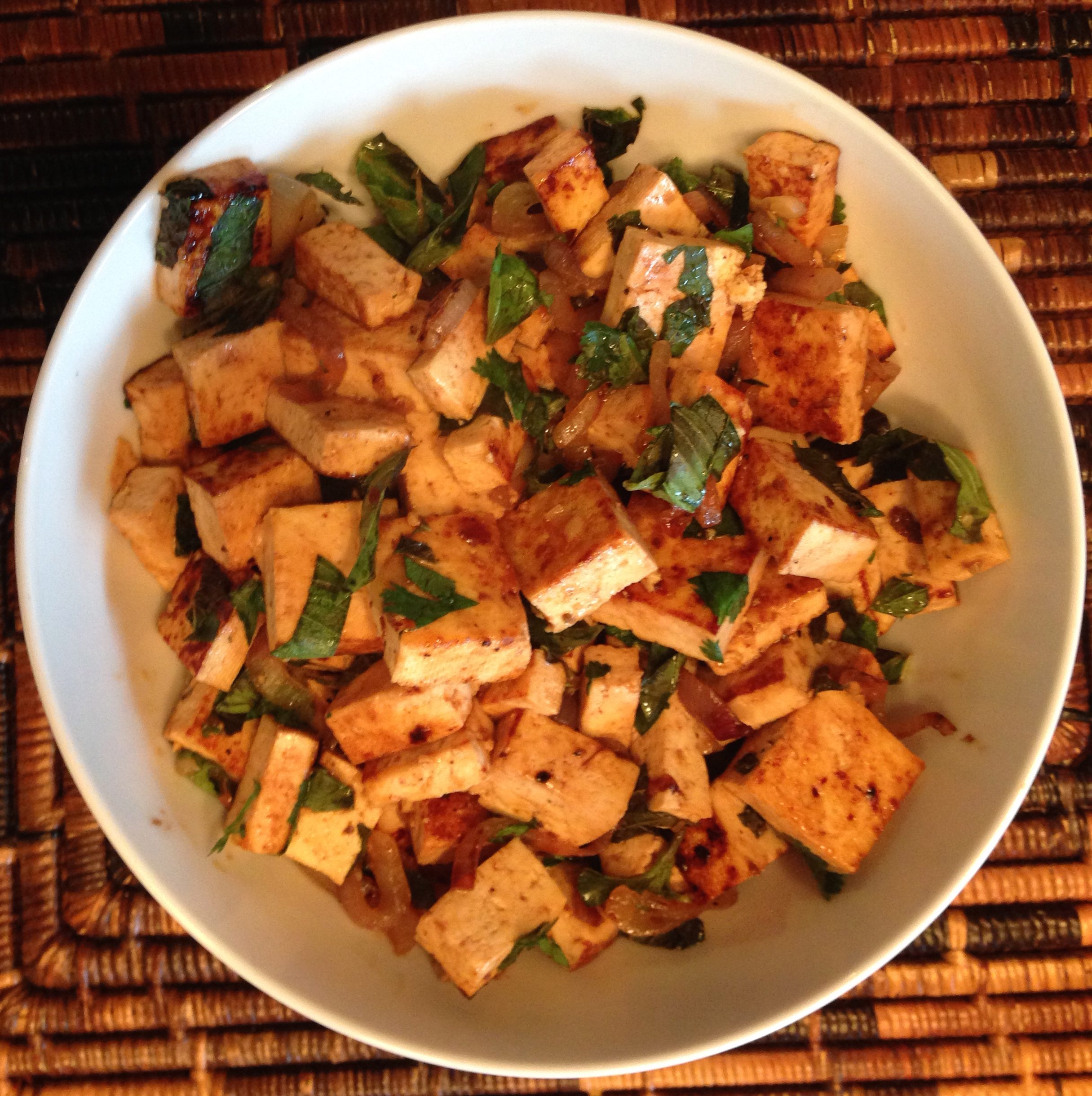 Chop the basil, mint, and cilantro leaves and place in a large mixing bowl. Squeeze the lime juice over the herbs and stir. Add the tofu mixture and stir to blend. Transfer the tofu mixture to a medium-sized serving bowl.