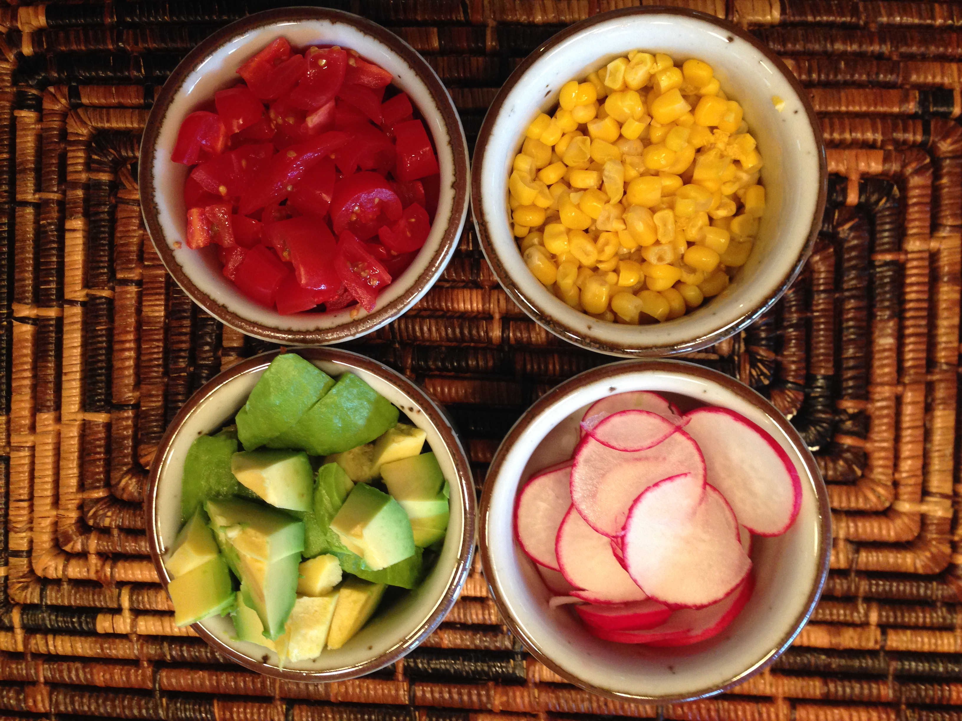 Place the chopped tomatoes, diced avocado, corn, and sliced radishes in separate small serving bowls.