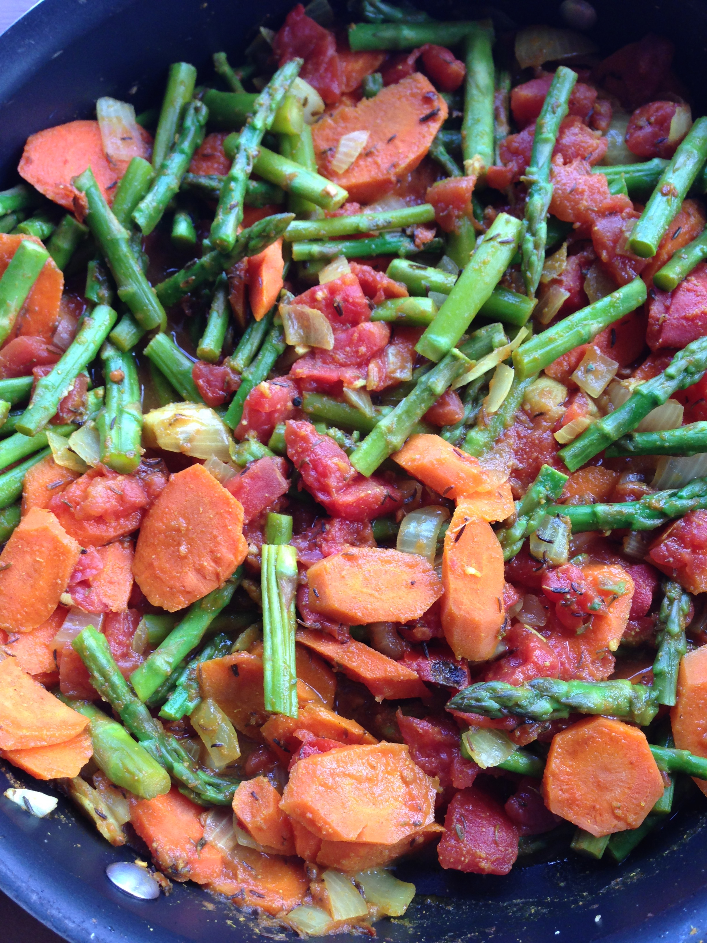 Place the coconut oil (1 teaspoon) in a large pan on medium heat and add the 2 teaspoons of brown sugar. Blend. Add the chopped onion. Sauté for 3-4 minutes until softened and translucent. Press the garlic through a garlic press and add to the onions along with the grated ginger. Stir for 1 minute and then add the sliced carrots, spices, tomatoes, and 1/2 cup of low vegetable sodium broth or water. Bring to a simmer, cover and cook for 5 minutes. Remove the cover and add the asparagus. Cover and cook for 10 minutes until the carrots are tender. For softer carrots cook for an additional 5 minutes but don’t overcook.