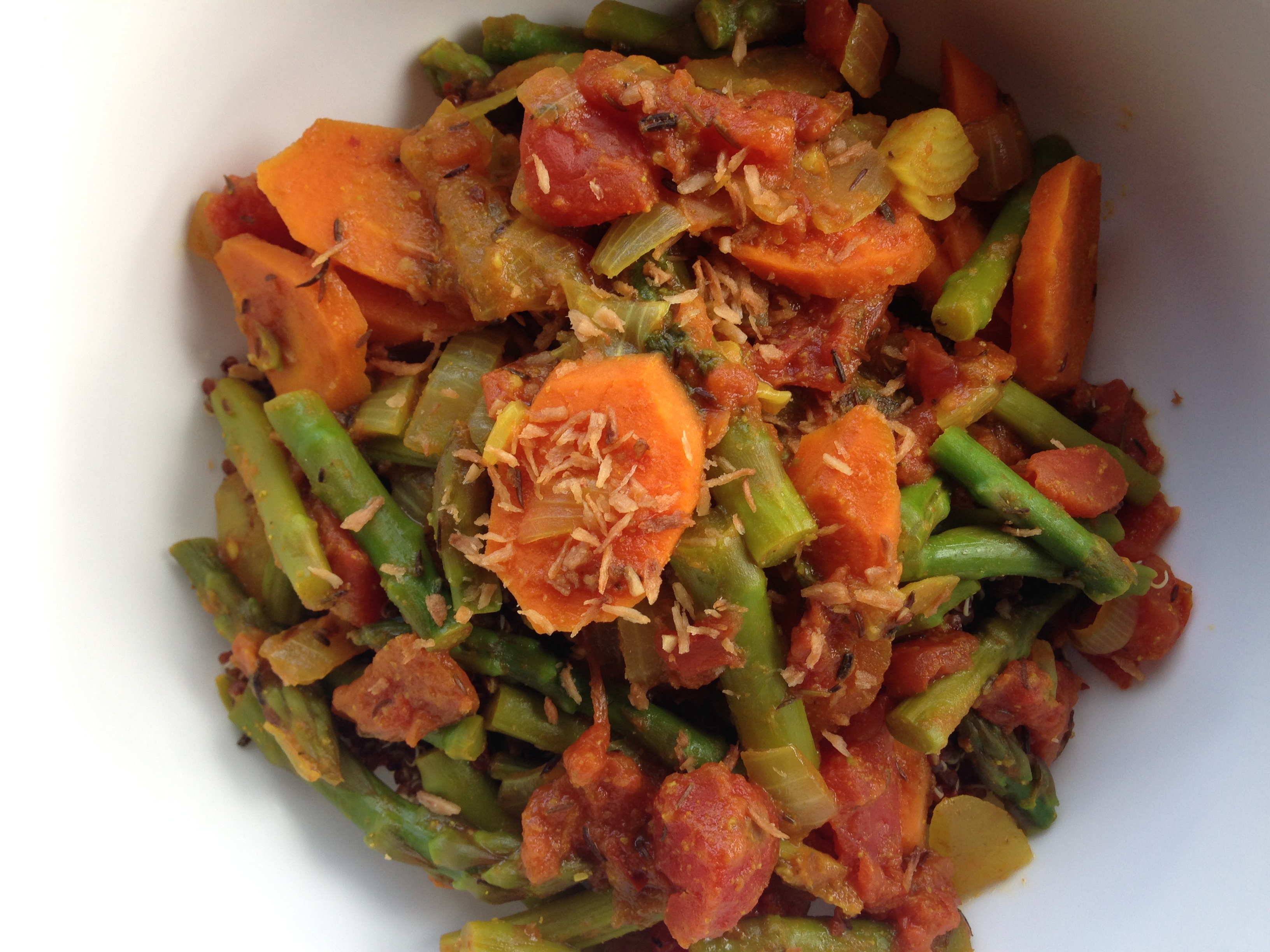 Asparagus Carrot Masala with Quinoa (serves 4 as a main course or 6-8 as a side dish)