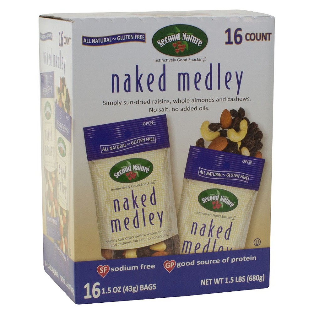 Second Nature Naked Medley: These single serving 1.5 ounce packets are filled with three ingredients: raisins, almonds, and cashews. No added sugar or salt. Buy a box with 16 single serve packets for $17.88 ($1.12 each) on Amazon (www.amazon.com).