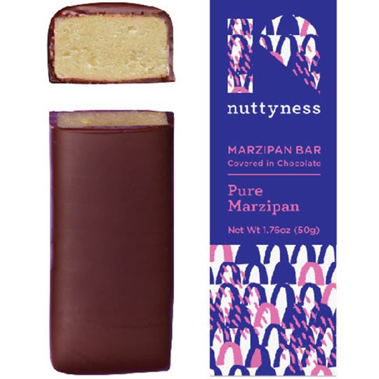 Today, Nuttyness makes three marzipan bars covered in dark chocolate: almond, pistachio, and hazelnut in what Nuttyness calls “Marzipan with a Twist.”