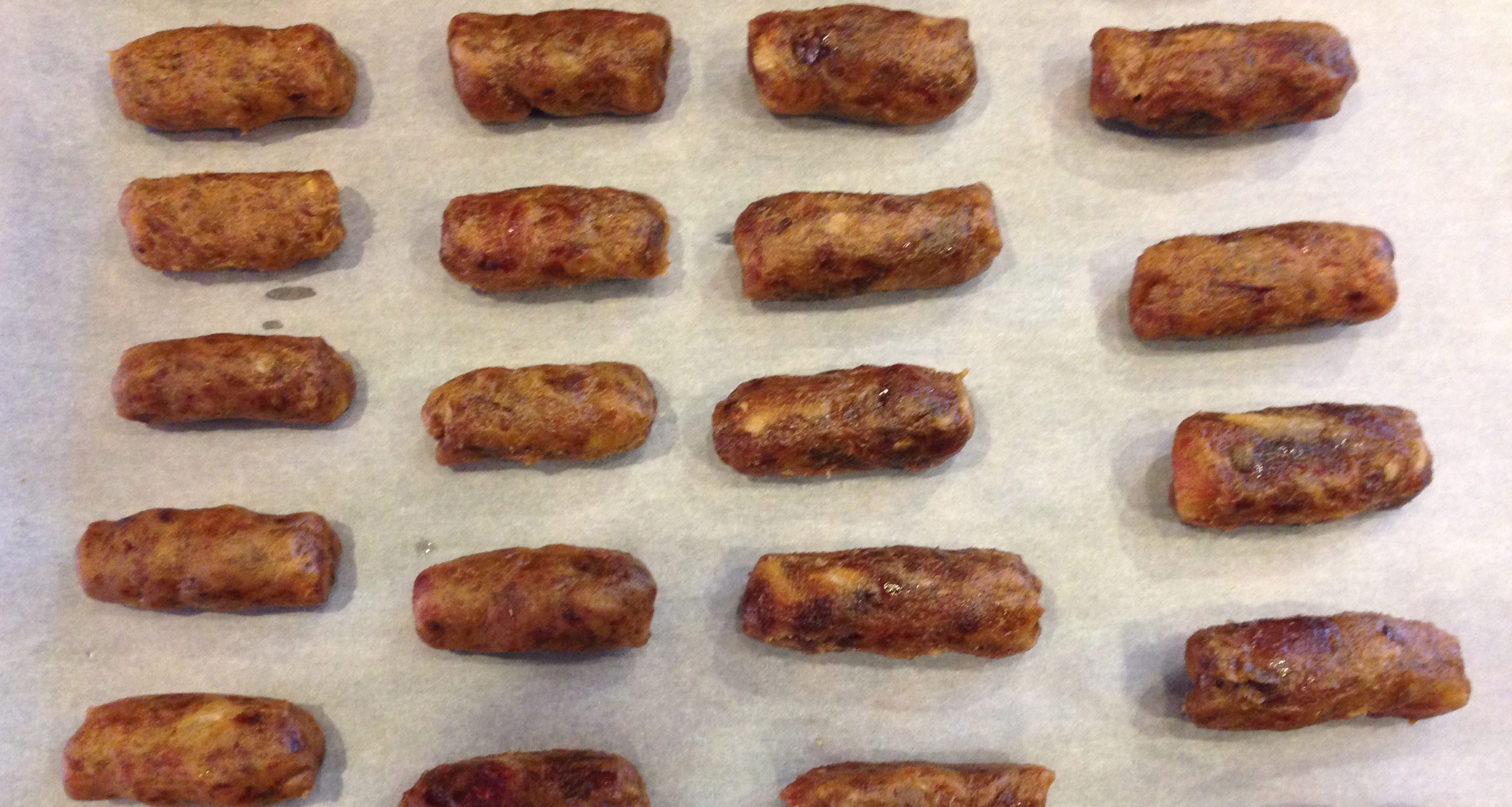 Moisten hands (place under faucet and gently wipe with a paper towel) and begin by rolling approximately 2 tablespoons of smashed dates into a 2-1/2 inch roll. Moisten hands periodically to make the batter easy to roll. Place the rolls on the parchment paper and continue until all the date batter is used. There should be about 30 rolls.