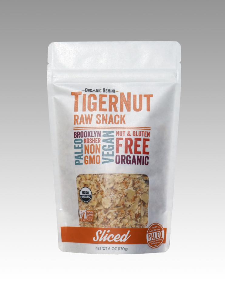 Organic Gemini of Brooklyn, New York packages organic, non-GMO, kosher, nut and gluten-free tiger nuts in a variety of forms: raw, raw sliced, and raw peeled with the raw sliced my favorite because the pieces are easy to chew and can be easily add to so many other breakfast or snack foods. Sold in 6 ounce resealable packets, the sliced raw tiger nuts can be purchased on-line for about $8 at www.vitacost.com. The packets can also be purchased nationwide at Whole Foods Market.