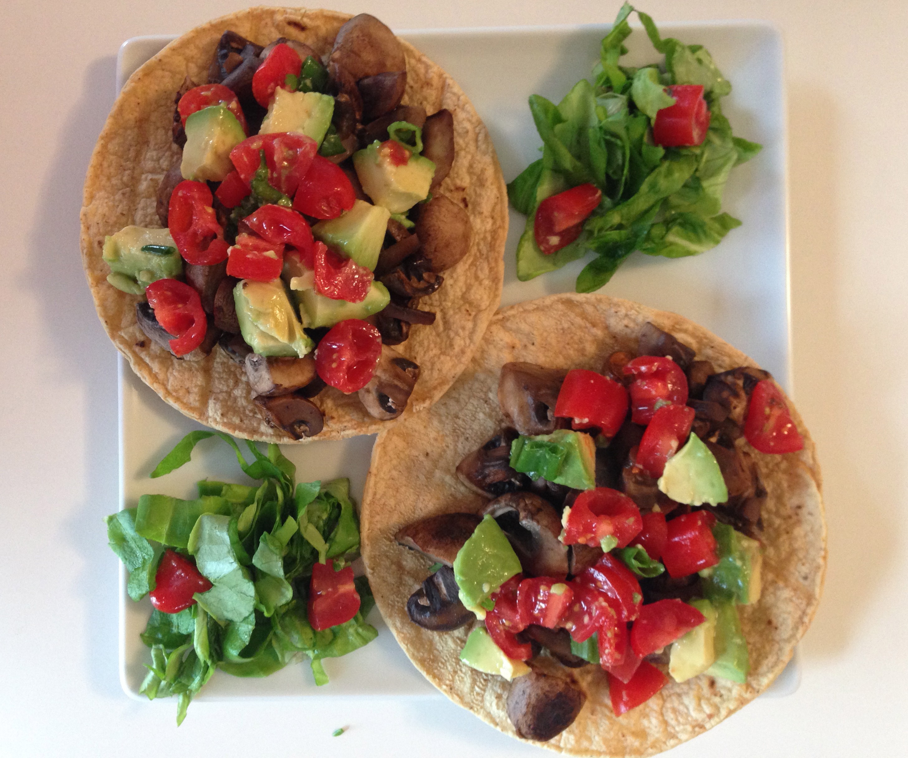 - Place the tortillas on a plate. Scoop the cooked mushrooms down the middle of the tortillas. Top with the avocado tomato blend and lettuce or place the lettuce on the side along with some salsa.