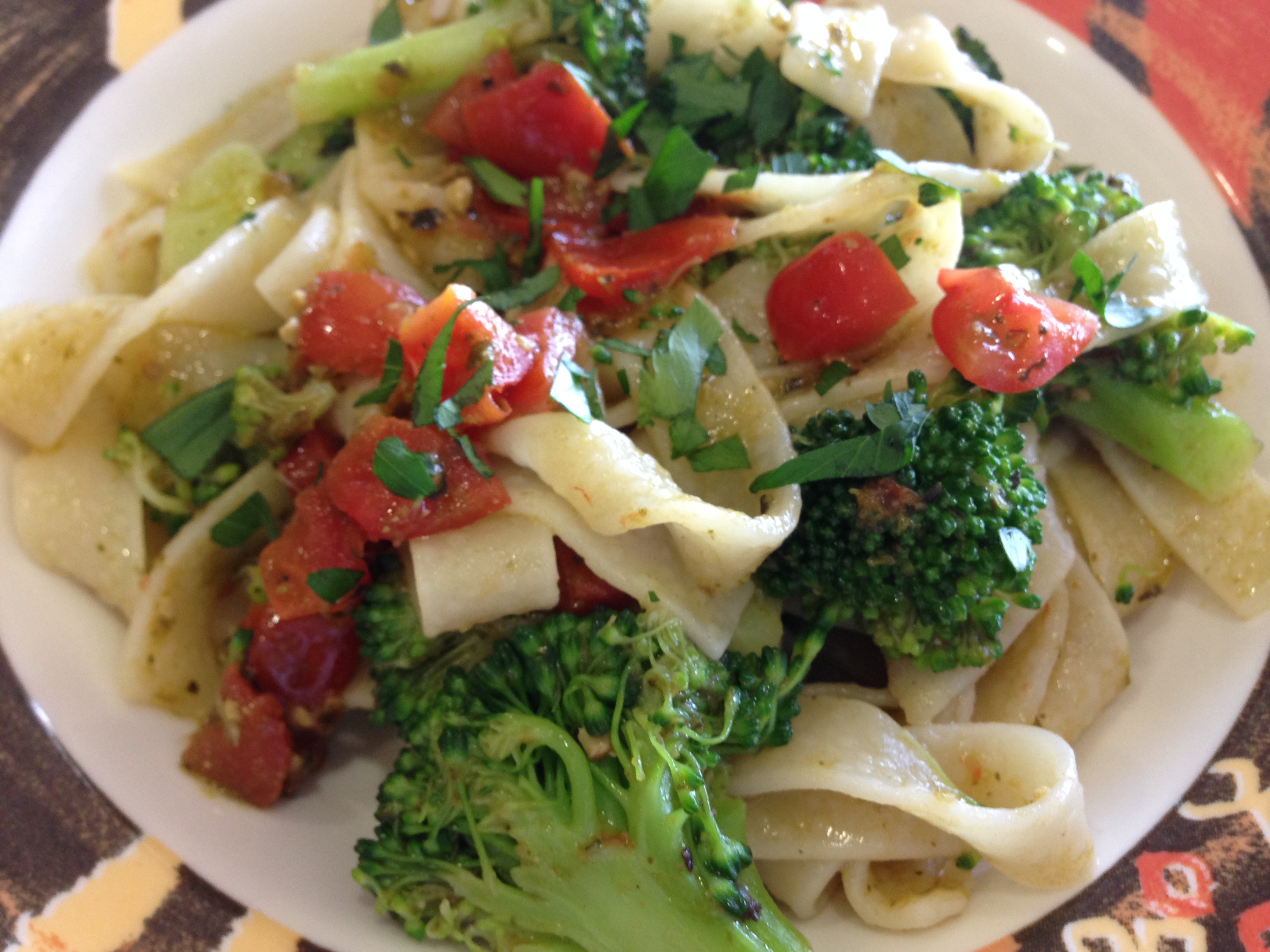 Consider making Tagliatelle with Tomatoes and Tuscan Kale Pesto which is made with 7 ingredients: Seggiano’s Tuscan Kale Pesto, low sodium (or no salt added) vegetable broth, tomatoes, broccoli, tagliatelle, parsley, and seasoning. Some people find pasta impossible to eat without sauce and cheese while others prefer pasta blended with sauce and vegetables. Me? I’m a sauce and veggie girl which is why I use tomatoes and broccoli (but feel free to substitute other vegetables if tomatoes and broccoli are not handy) combined in a light kale pesto sauce to make this main course.