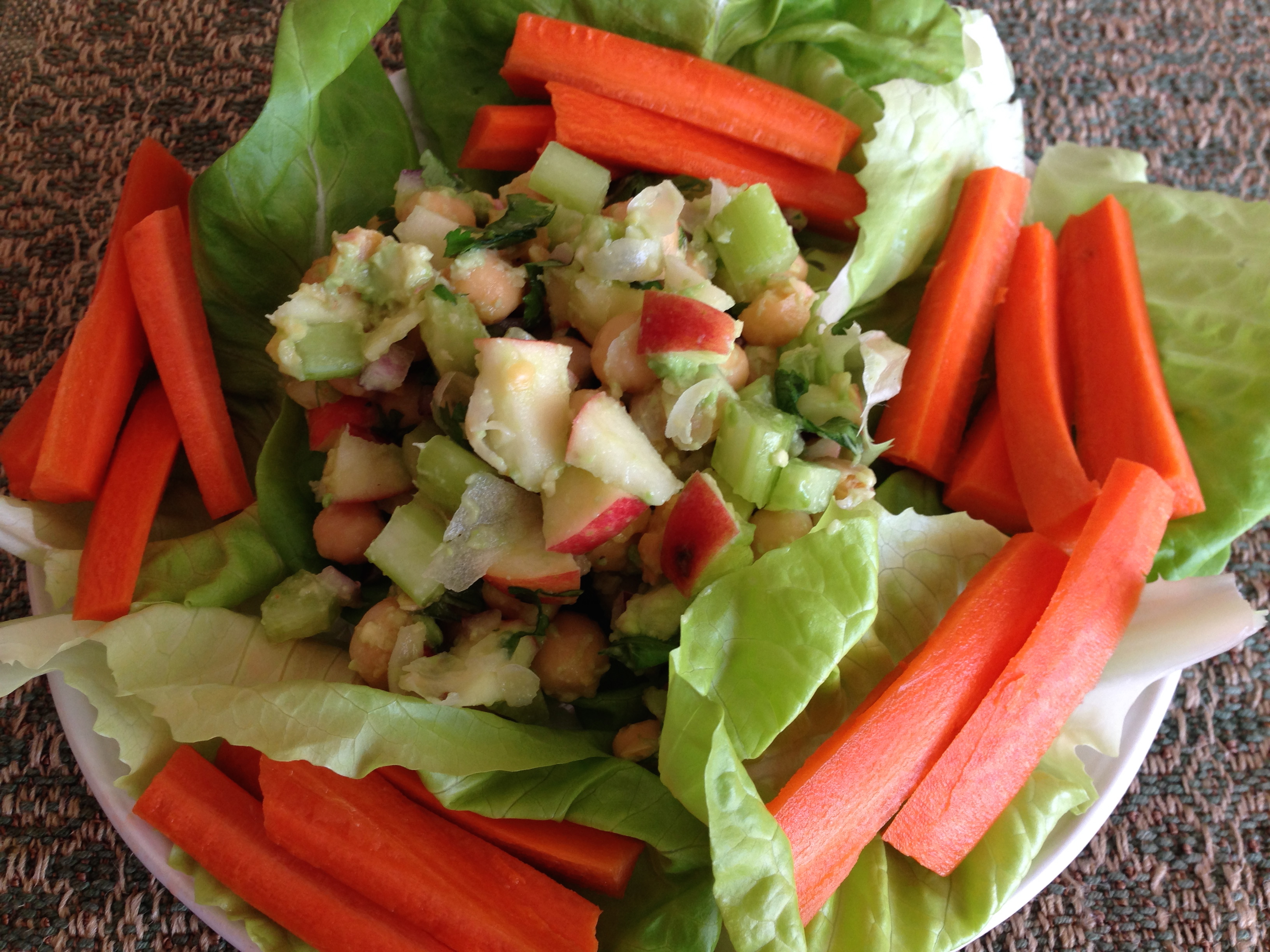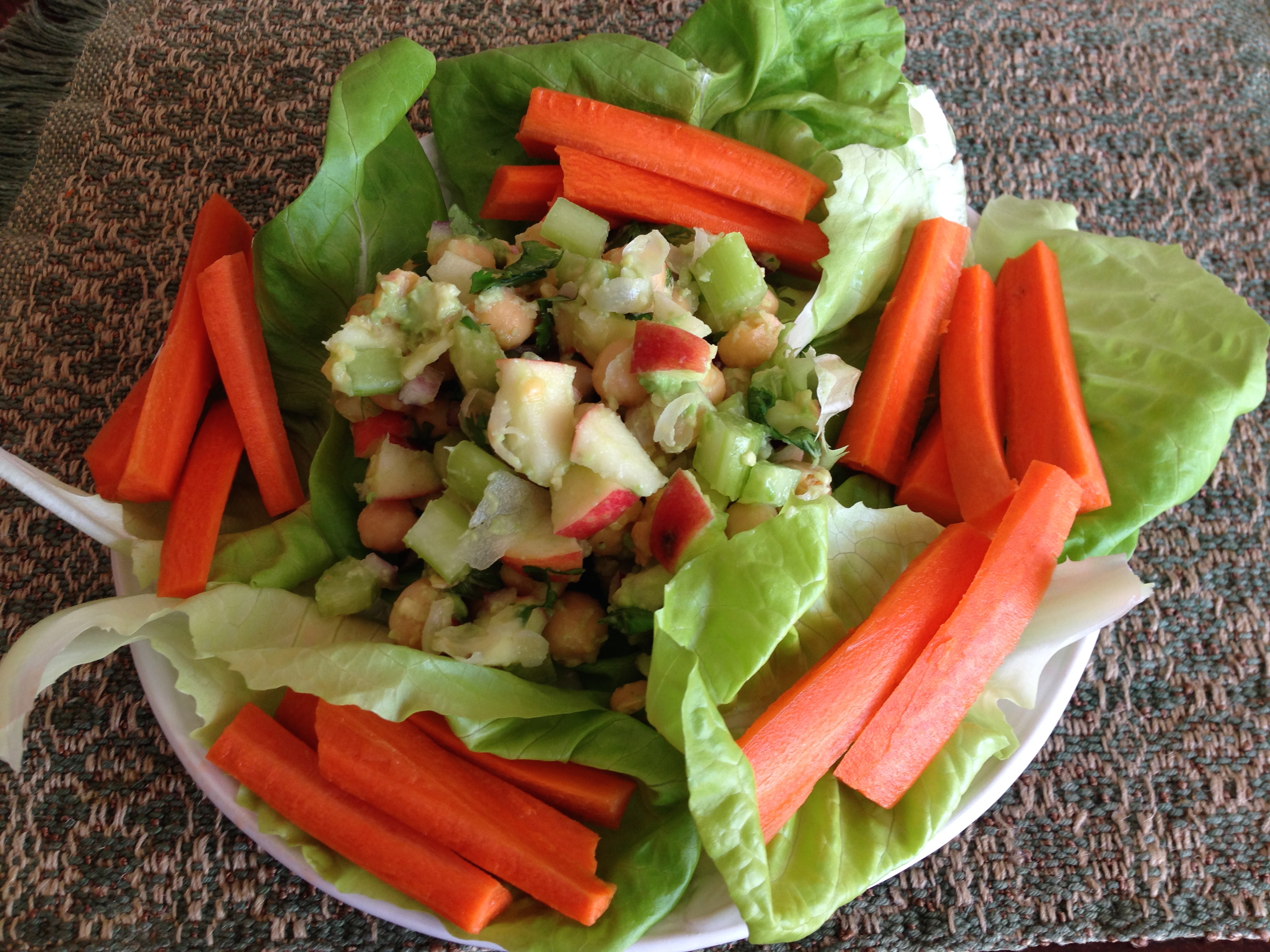 - Place lettuce leaves on a plate and pile the salad on the plate. Add carrot sticks and serve.