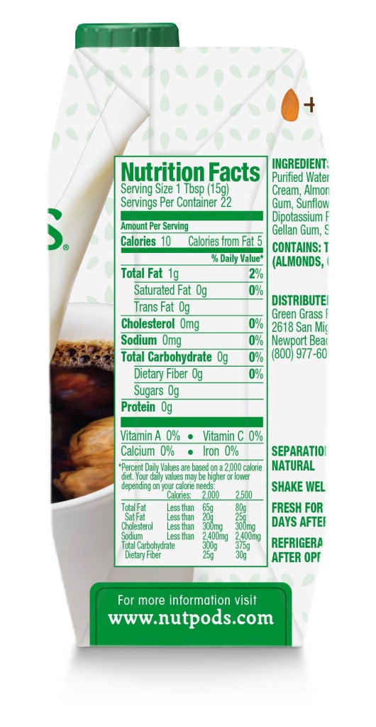 Nutritionally, a 1 tablespoon serving has 10 calories with 1 gram of fat, no sugars, and no sodium. The Hazelnut and French Vanilla Nutpods also contain natural flavors (as opposed to hazelnuts and vanilla extract which is probably the only criticism one could make of Nutpods). For those of us who prefer an unflavored coffee, the Nutpods Original works perfectly.