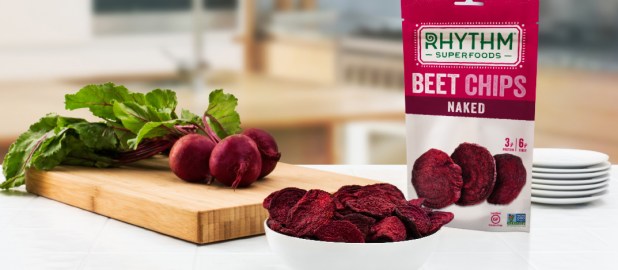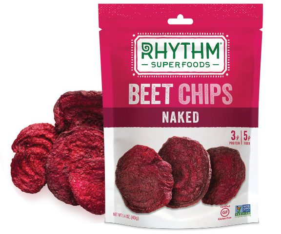 At Rhythm Superfoods, beets are gently dehydrated and then roasted raw or with a touch of sunflower oil to make a crunchy, delicious chip that naturally contains a lot of fiber, potassium, and other nutrients.
