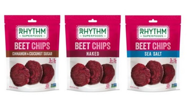 Organic, gluten-free, and vegan Rhythm Superfoods Beet Chips come in three flavors: Naked (which is just beets), Sea Salt, and Cinnamon & Coconut Sugar.