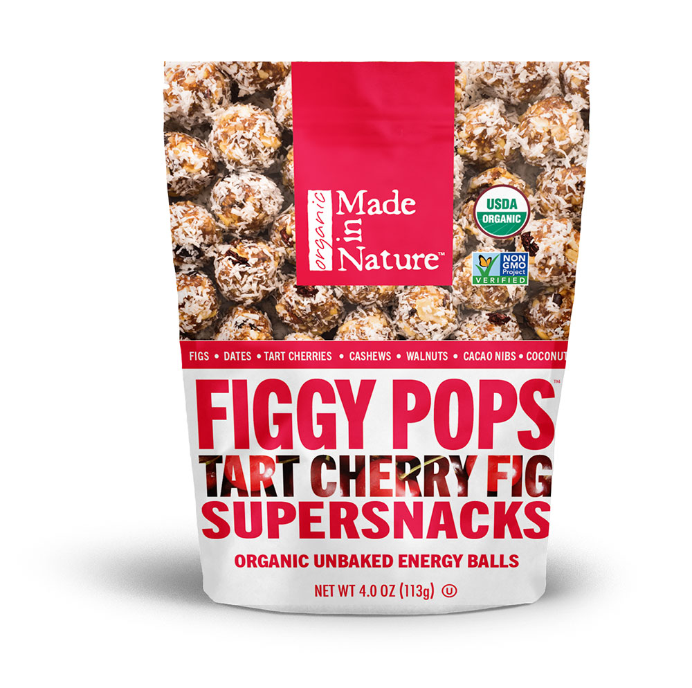 Tart Cherry Fig: My favorite Figgy Pop and the true original super snack. Figs, dates, and tart cherries are combined with cashews, walnuts, coconut, gluten-free oats, coconut, coconut oil, cacao nibs, maple syrup, cinnamon and sea salt.