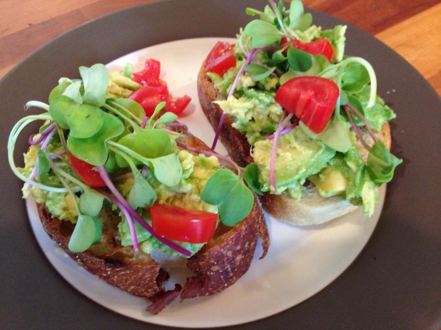 Smash the avocado lightly with a fork and add a touch more of salt. Pile the smashed avocado on the toasted bread pieces and top with radish sprouts (a member of the mustard family that have a slightly spicy, hot flavor; look for them in the refrigerated area of your grocery store where other sprouts are sold) and chopped sweet Villagio Marzano tomatoes (also available at Trader Joe’s) for the perfect avocado toast.