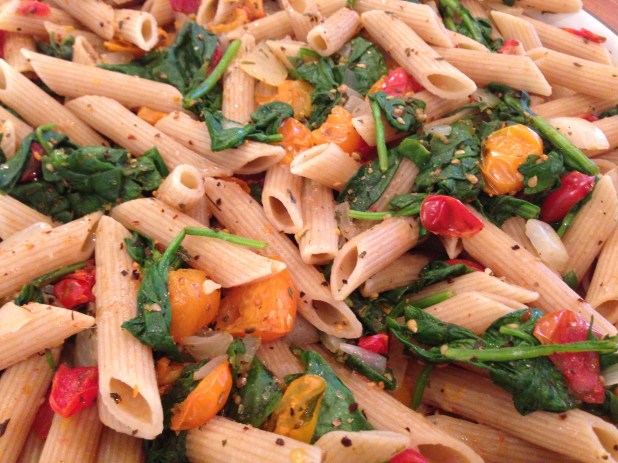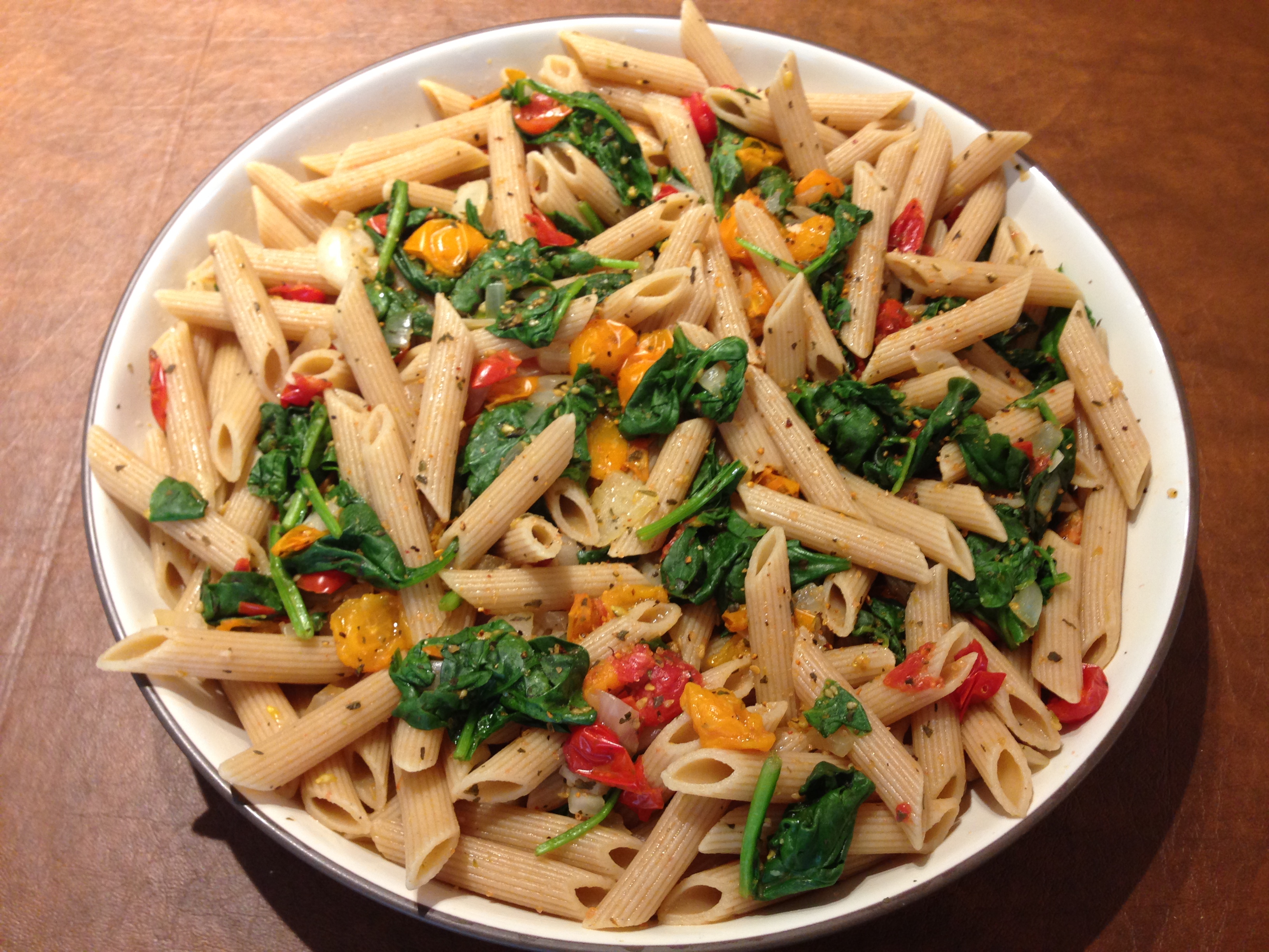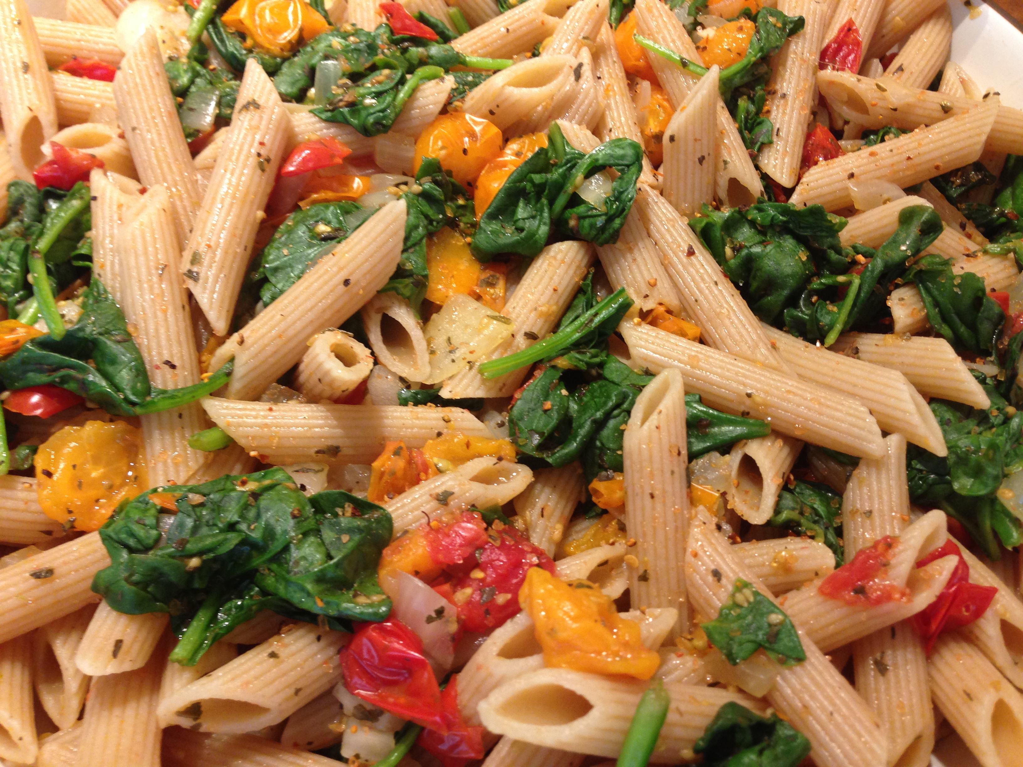 A colorful pasta salad is the perfect meal on a warm summer evening especially when the whole meal takes less than 20 minutes from start to finish. Fresh, locally grown sweet cherry tomatoes are in season but any type of chopped tomatoes will work along with a sweet Vidalia onion, and lots of fresh spinach with whole grain pasta – but green zucchini, yellow squash, multi-colored peppers, and broccoli florets also make for a delicious pasta salad. Let your taste buds drive your recipe but know that seasoning is essential; otherwise, the pasta salad will be bland.