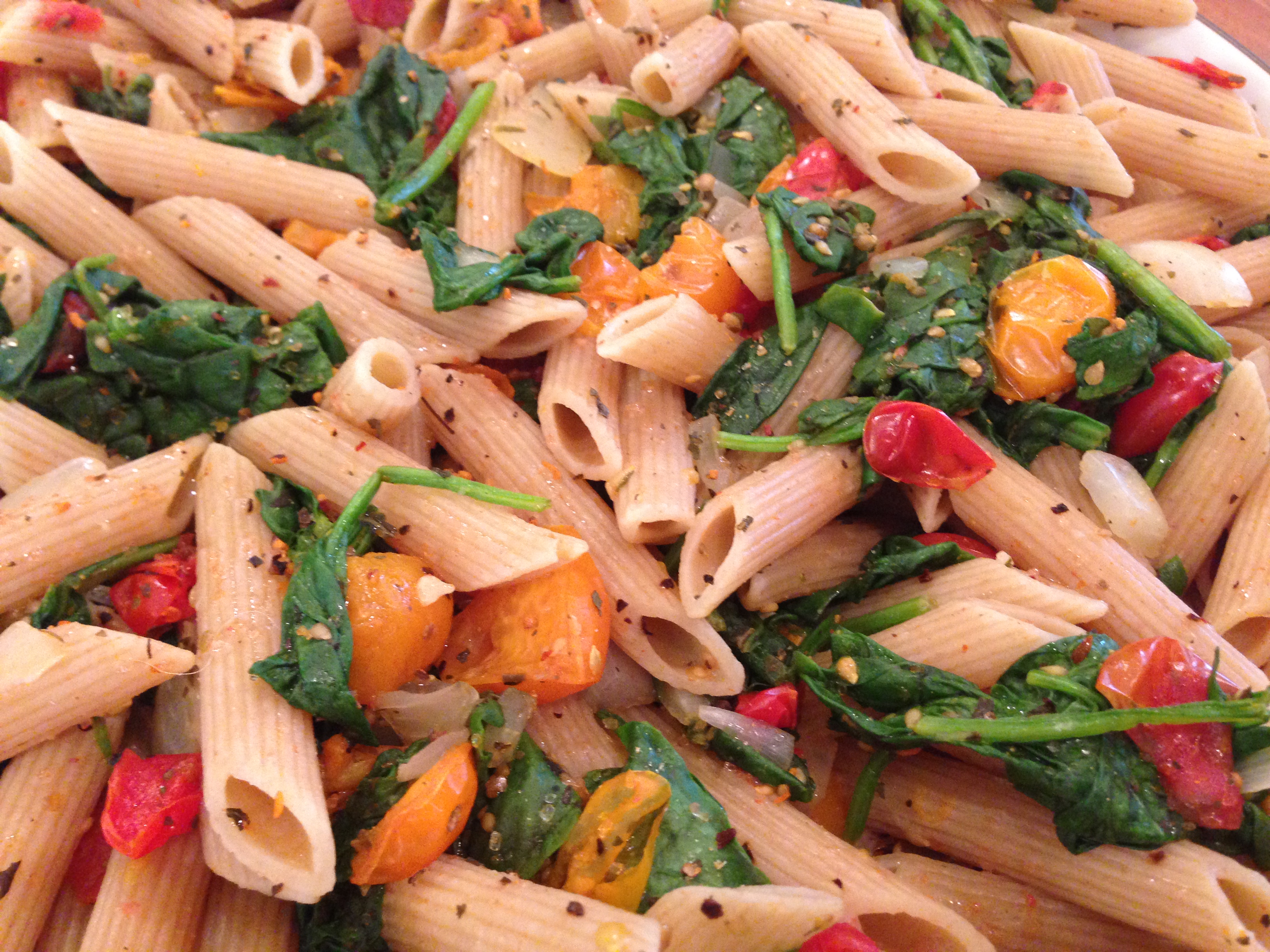 - Pour the pasta into the onion/tomato/spinach mixture and stir to blend or use tongs to distribute the vegetables among the pasta. Season with salt and stir and transfer to a large serving bowl. Garnish with fresh basil, optional.