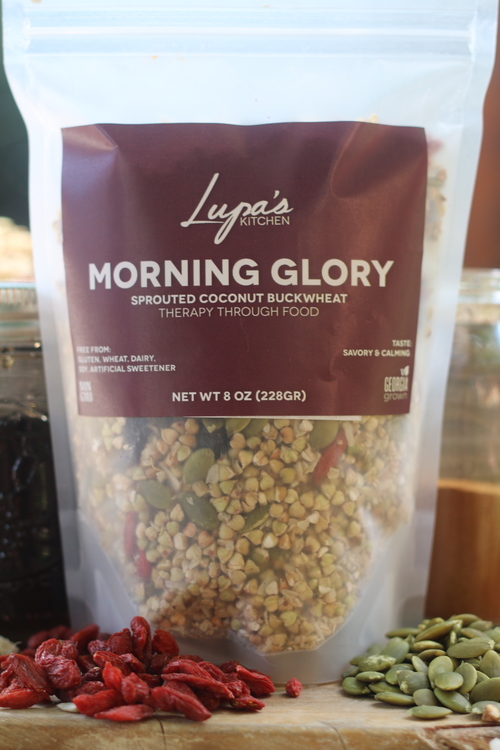 Packed in 8-ounce resealable packets, Lupa’s Morning Glory Sprouted Coconut Buckwheat sells for about $10 per packet at fine grocery stores in the southeastern United States or purchase on-line directly from Lupa’s Kitchen at www.lupaskitchen.com where 4 packets are $39.99.