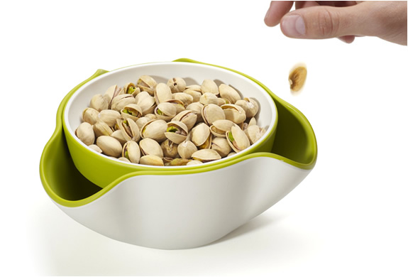 Two brothers (Anthony Joseph and Richard Joseph) formed Joseph Joseph – a company that works to “identify everyday problems and solve them by designing functional solutions” came up with the perfect solution: the Joseph Joseph Double Dish™ – a simple yet effective way to dispose of unwanted or unsightly food pieces instead of using a separate bowl. With one bowl nesting atop another slightly larger bowl with three curved chutes, shells and pits can be disposed of in a discreet way.