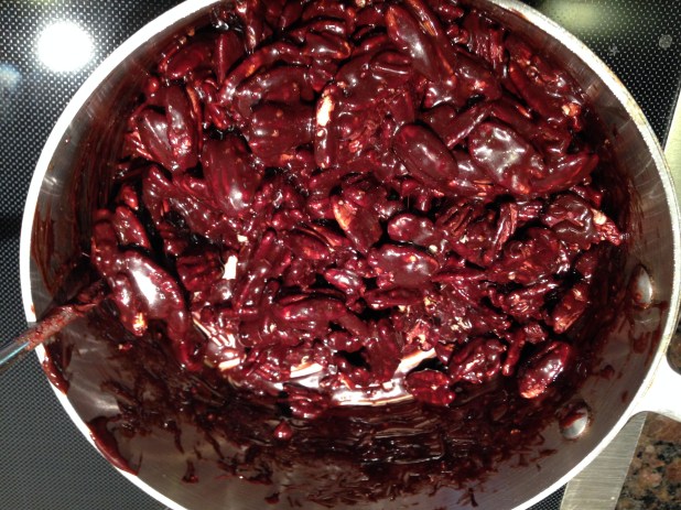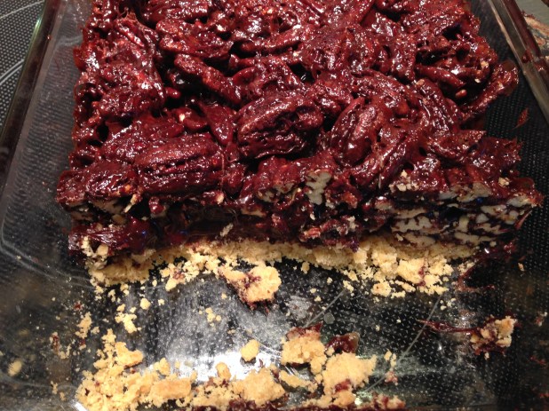 Using a basic pie crust dough recipe (you don’t have to know how to roll out a crust because you will be patting the dough into the baking dish) and a variation of the filling of Fran Costigan’s Chocolate Pecan Pie recipe from her Vegan Chocolate cookbook, comes the following recipe for Chocolate Pecan Bars: