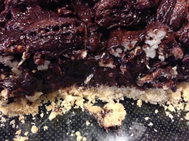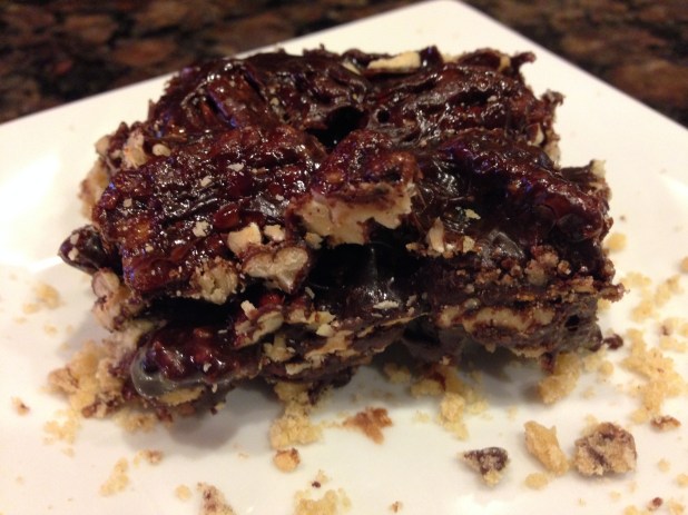 Instead of a gooey chocolate pecan pie, I made a pie that was solid as a rock. My husband – not one to let an error fly by without a laugh – literally picked up the center of the baked pie with a fork and lifted it into the air. Seeing that whole pie stand in mid-air with just a fork holding it up, I realized that my decision to add significantly more pecans changed the dessert from a pie to a bar.