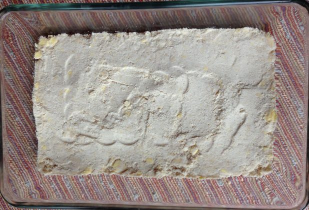 Transfer the flour mixture to a medium-sized mixing bowl. Add the ice-cold water one tablespoon at a time blending with a large mixing spoon. The crust will not come together. Pour the flour mixture into the glass baking pan and using a spatula, gently pat the flour mixture into the bottom of the pan evenly.