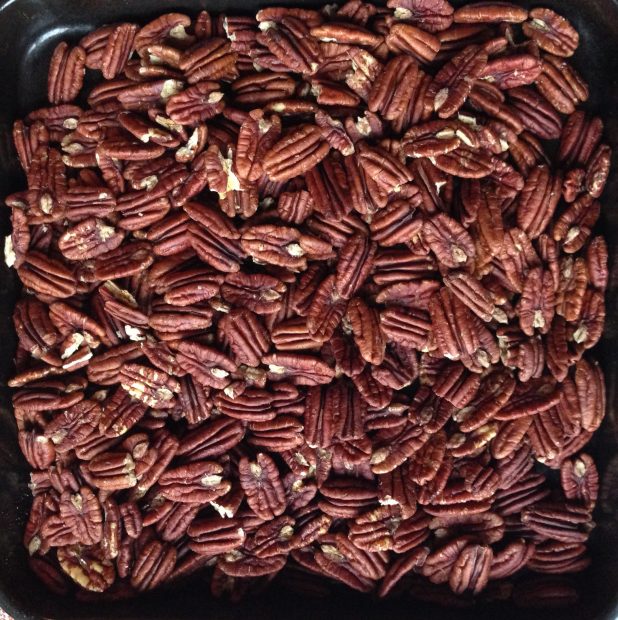 Bake the raw pecans at 275 degrees for 30 minutes. Roasting the pecans brings out the flavor of the nuts so don’t skip this step.