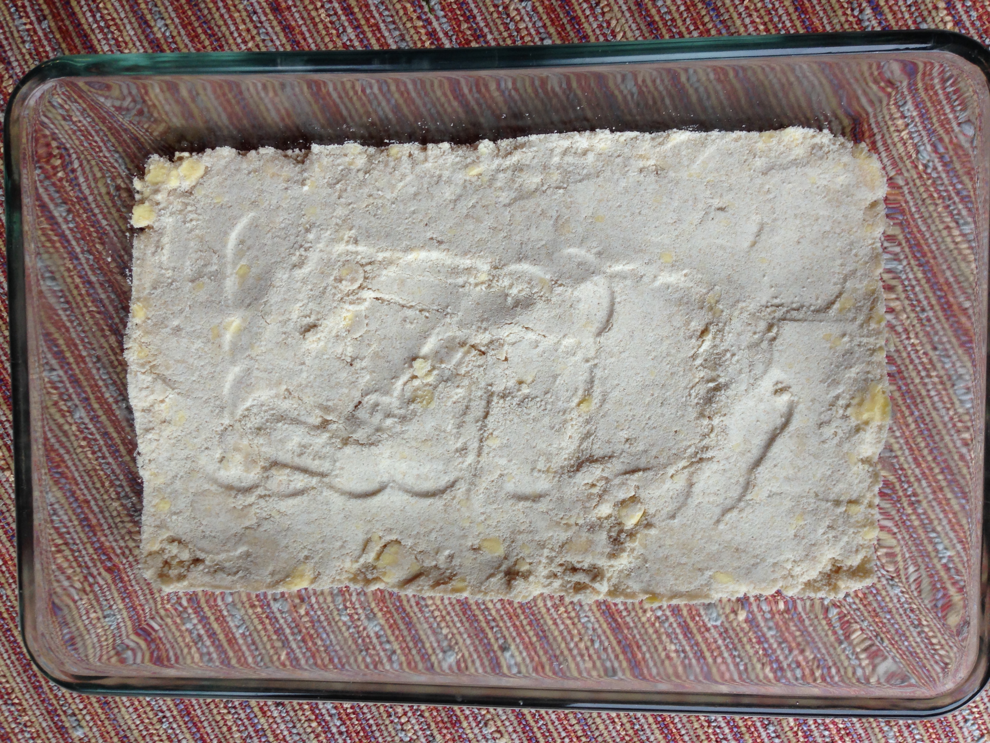 Transfer the flour mixture to a medium-sized mixing bowl. Add the ice-cold water one tablespoon at a time blending with a large mixing spoon. The crust will not come together. Pour the flour mixture into the glass baking pan and using a spatula, gently pat the flour mixture into the bottom of the pan evenly.