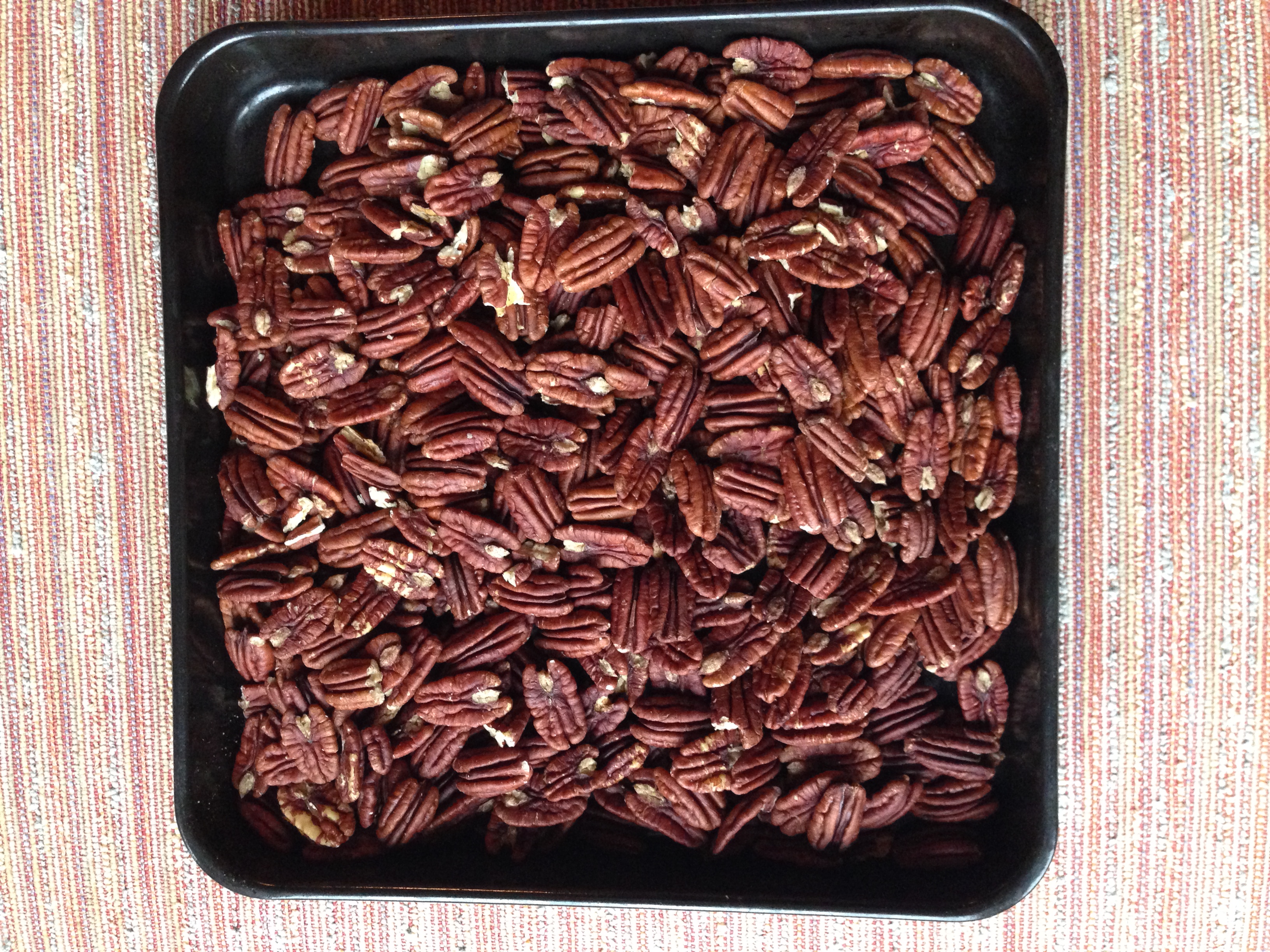 Bake the raw pecans at 275 degrees for 30 minutes. Roasting the pecans brings out the flavor of the nuts so don’t skip this step.