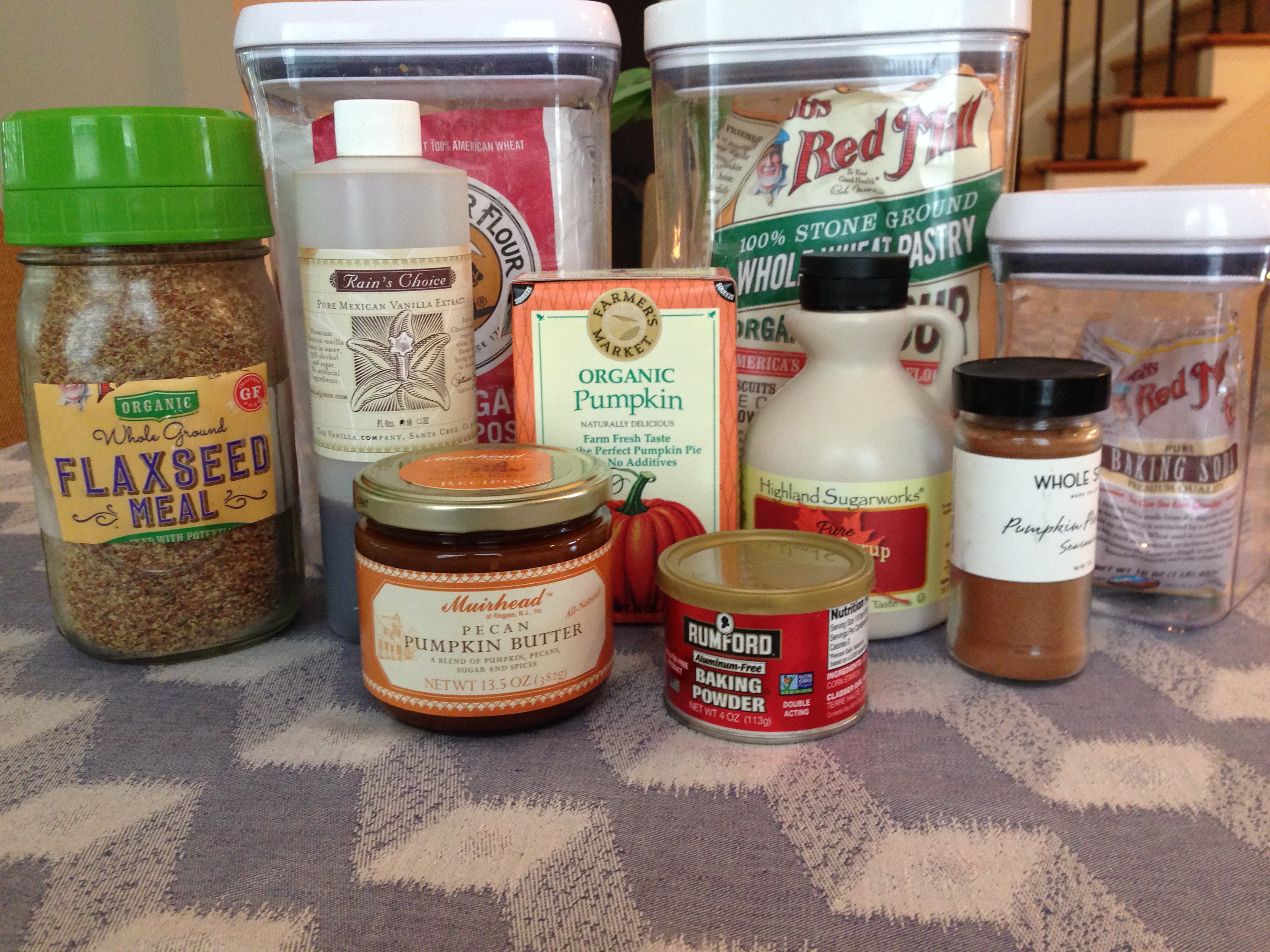 In a large mixing bowl, blend the flours, baking powder, baking soda, flaxseed meal and pumpkin pie spice.
