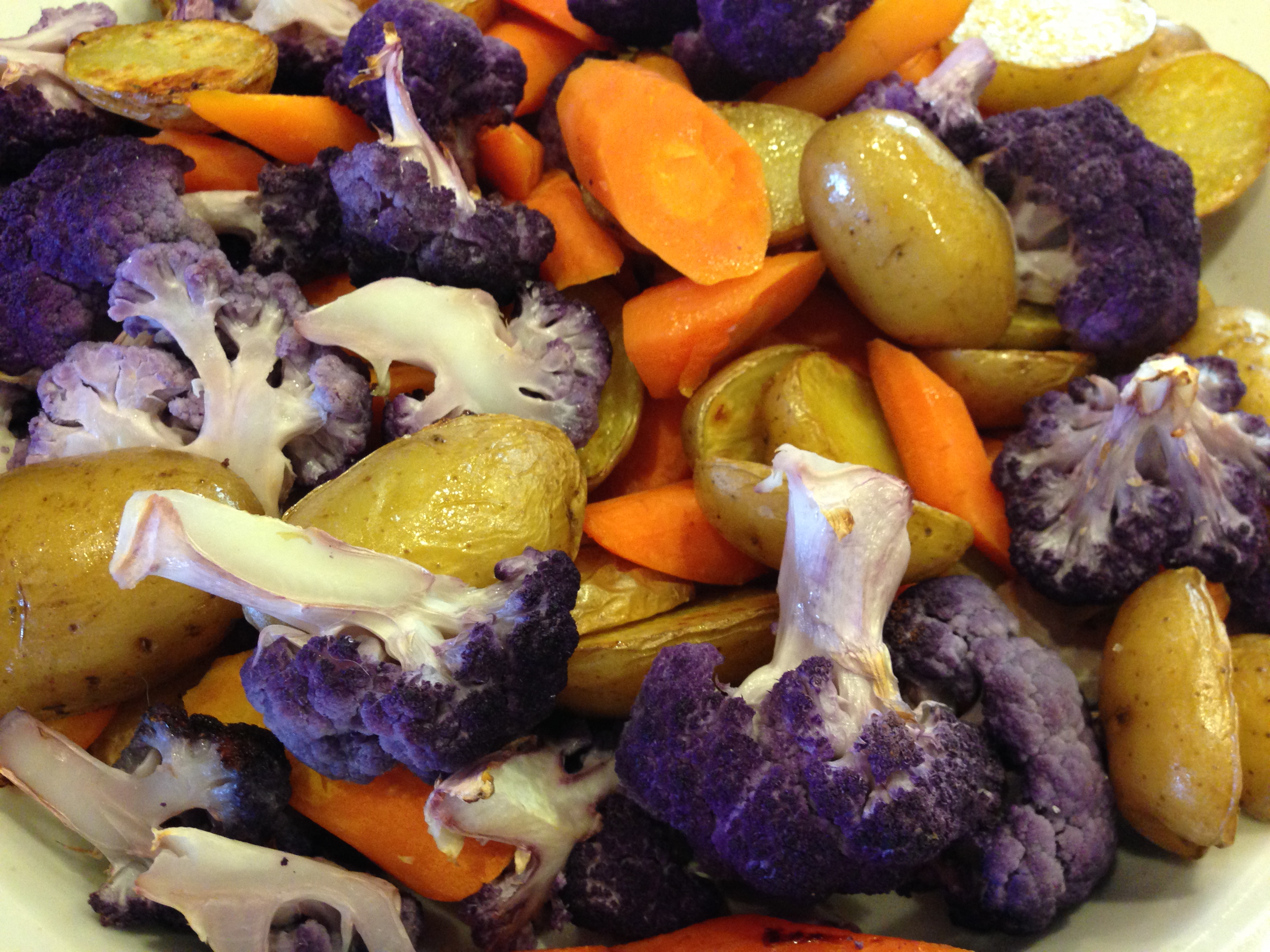 Every Autumn (in most states), the leaves on the trees seem to explode in a rainbow of reds, yellows, oranges, and browns. But, enjoying the array of color is not limited to outdoors. Vegetables – particularly root and squash varieties – are plentiful so consider making a Harvest Veggie Roast in your kitchen. Golden potatoes and orange carrots combined with purple cauliflower adds just the right amount of boldness in color and flavor to this roasted vegetable dish.