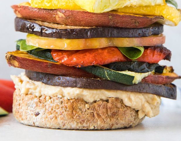 or to make a scrumptious sandwich filled with veggies any time of the day. Simply fork-split the muffin, toast it and pile on your favorite raw or cooked vegetables along with some hummus:
