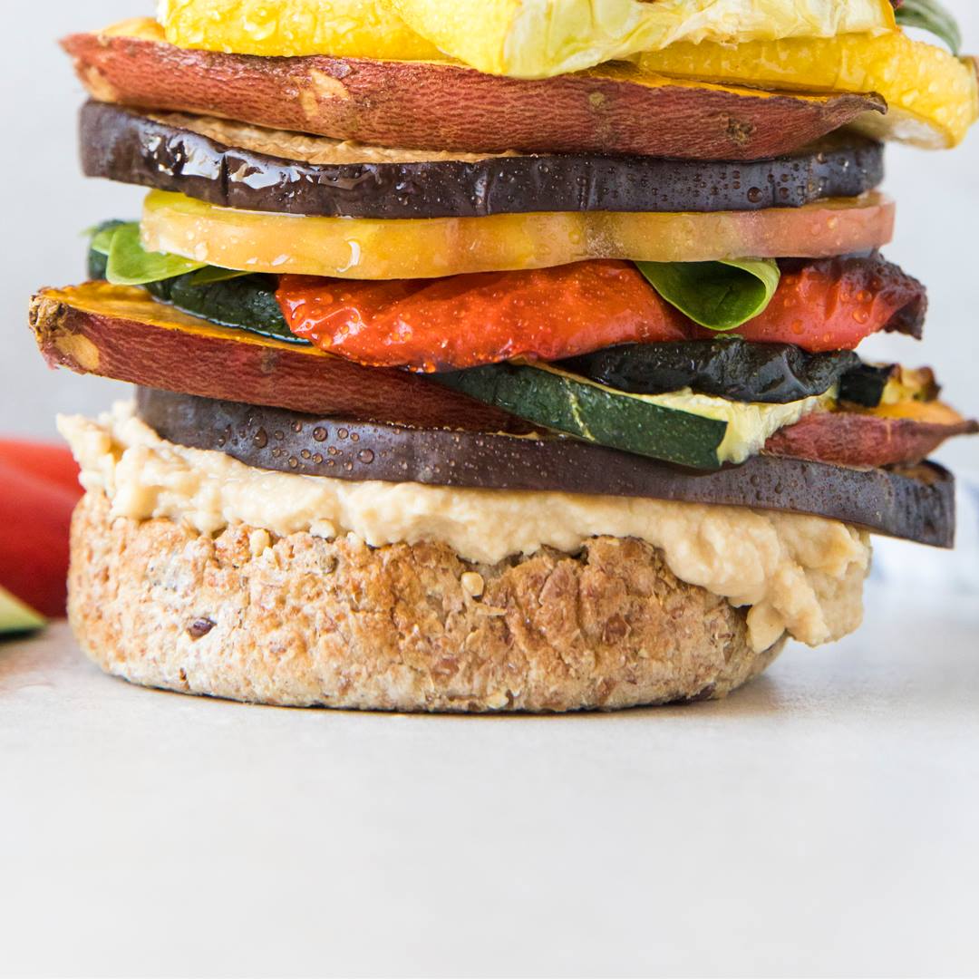 or to make a scrumptious sandwich filled with veggies any time of the day. Simply fork-split the muffin, toast it and pile on your favorite raw or cooked vegetables along with some hummus: