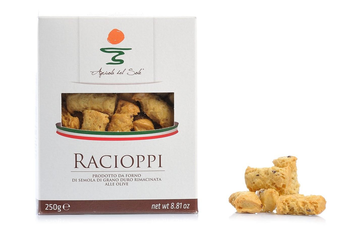 Crunchy, crispy, and delicious, these crackers are distinguished by their shape: Tarallini are shaped like rings while Racioppi look like small corks or dried pinches of pasta, and Chianchette (named for chianche which are flat stones used to cover the lanes in the old city center in the province of Bari) are squares with a touch of fennel. All are delicious as is or with your favorite topping.