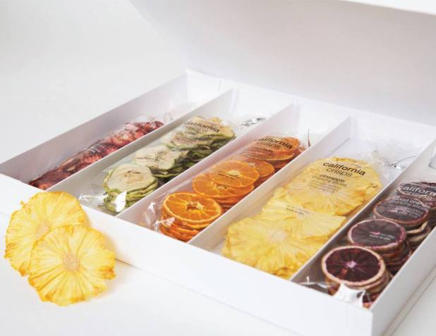 A 3-piece (mandarin, pineapple, and blood orange crisps) Assortment Box for $21.99 or crate for $23.99: