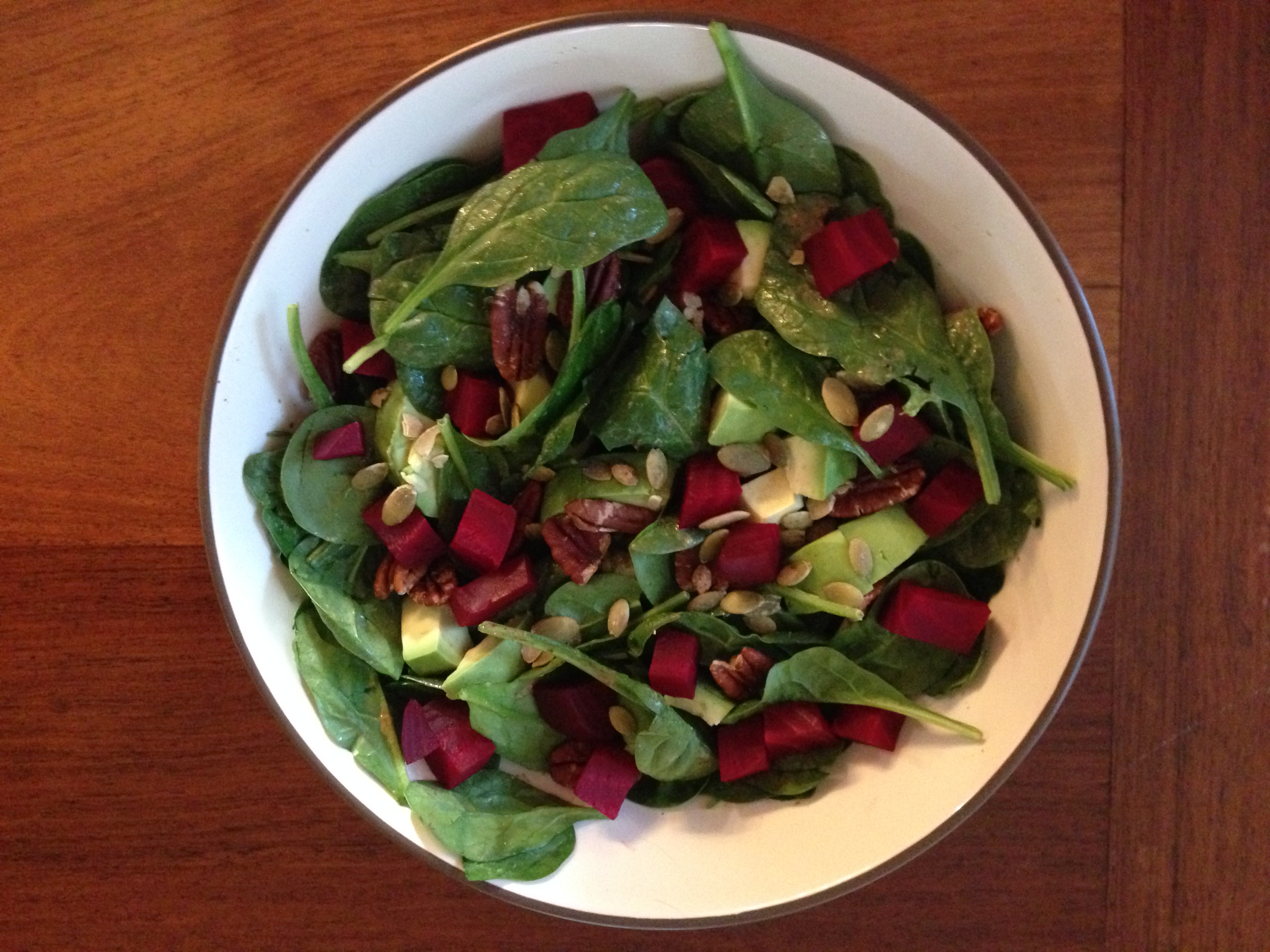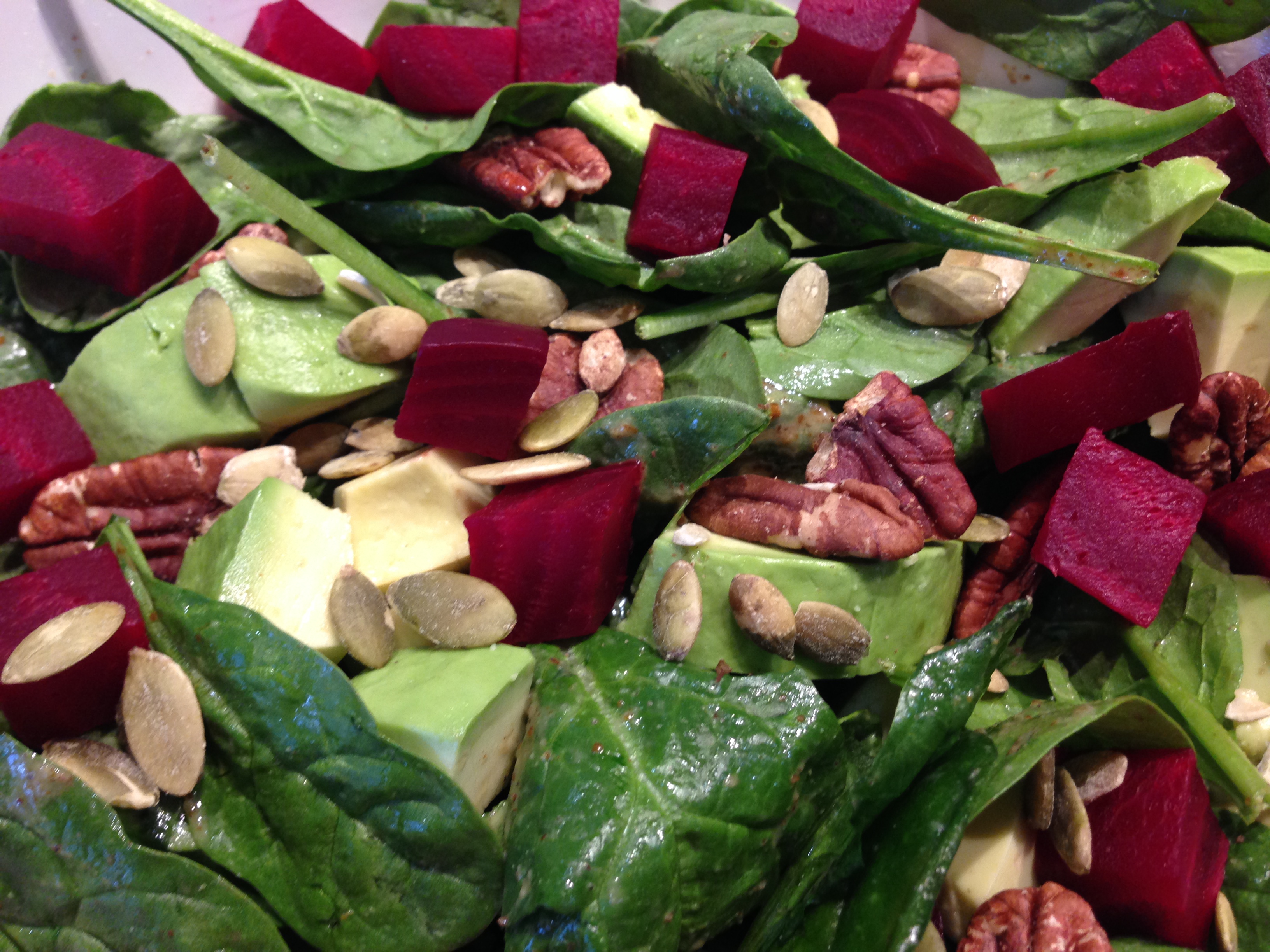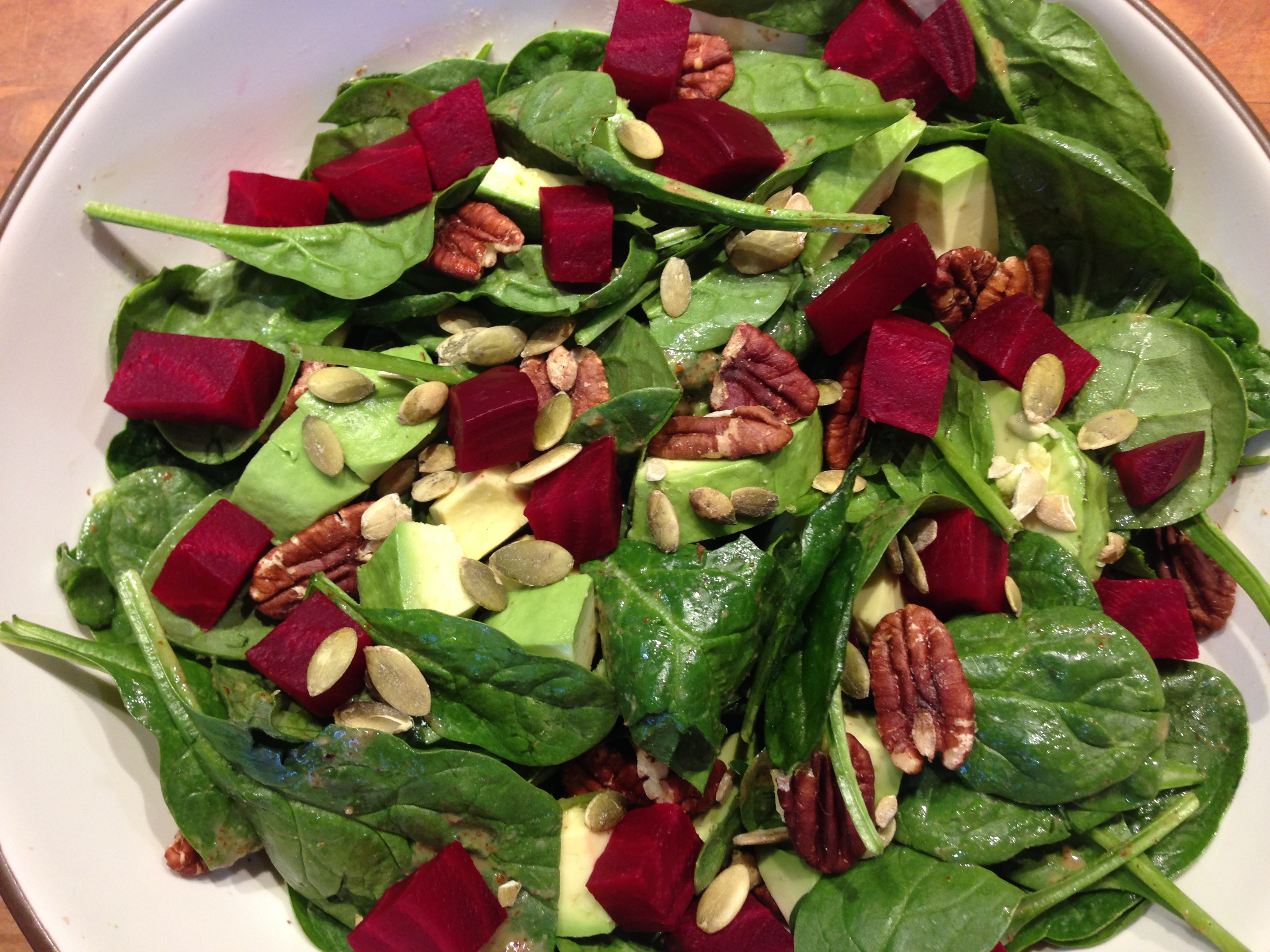 Spinach Salad takes on a new twist this holiday season with the addition of fresh, organic roasted red beets. The dark green spinach leaves tossed with a light mustard maple salad dressing and then sprinkled with dark red beets, light green avocado pieces, lightly toasted pecan halves, and roasted pumpkin seeds makes for a nutritious and delicious lunch or dinner salad.