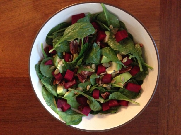 The Holiday Spinach Salad was inspired by Isa Chandra Moskowitz’s recipe for Roasted Yellow Beet Salad with Warm Maple-Mustard Dressing – a light summertime salad that I often make during the warm months. The Holiday Spinach Salad is a bit more substantial with the yellow beets replaced with red beets and the addition of fresh avocado chunks and crunchy pumpkin seeds – and the omission of red onion.