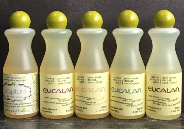 After several bad experiences with dry cleaners, I started hand washing clothes that recommended dry cleaning but I wasn’t always happy with how the clothes turned out. I never gave much thought to laundry detergents until I visited a yarn shop, saw a shelf lined with bottles of Eucalan and heard a young man (all of 24 years old) say he uses Eucalan to clean his sweaters. Perplexed, I silently considered how a 24-year old guy could know about a speciality laundry product and I didn’t? Turns out his mother has been using Eucalan for years (this renewed my faith that maybe children do listen, watch, and learn from their parents).