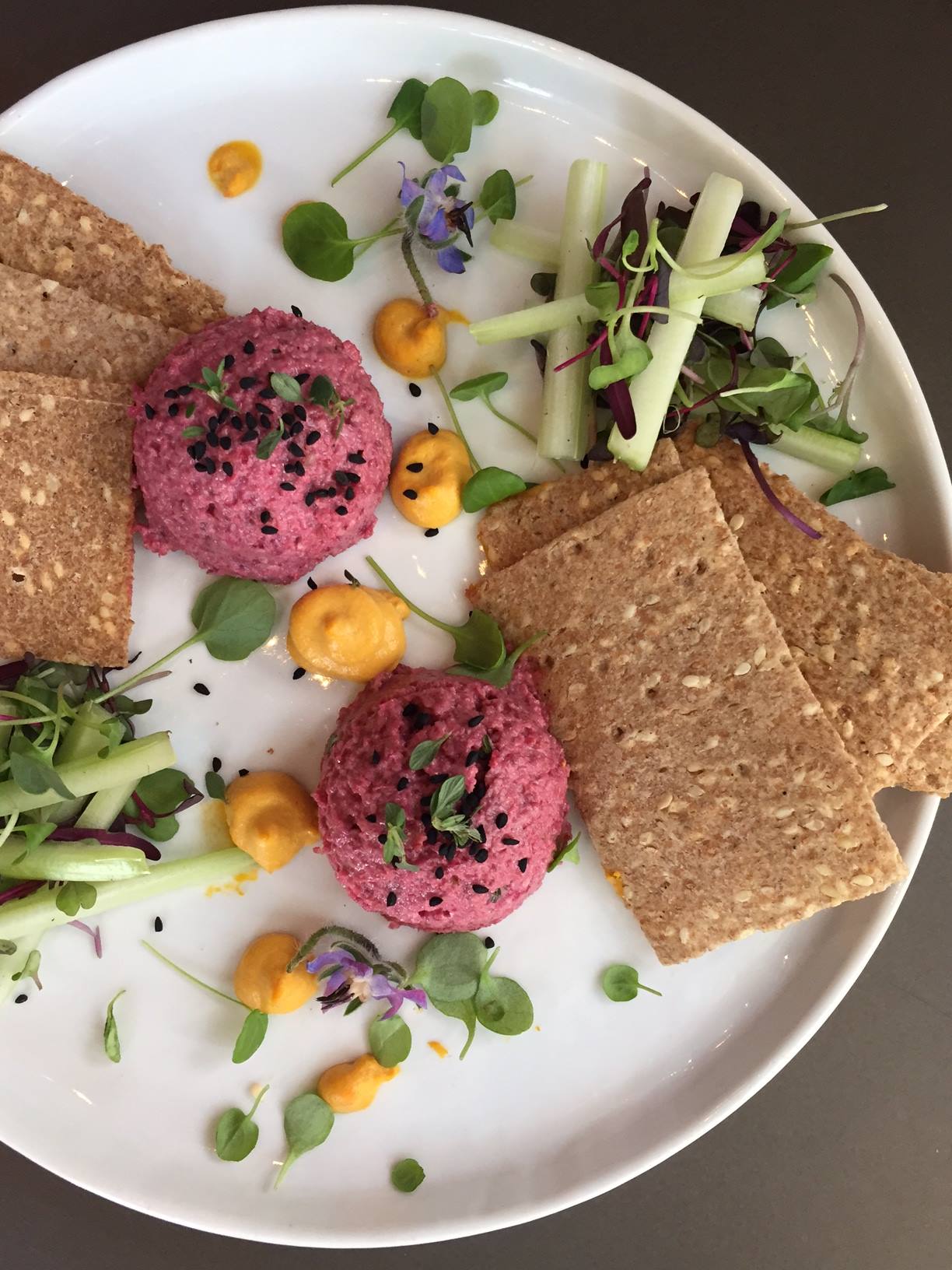 Start with the Sunflower-Beet Hummus with spelt-sesame or gluten-free crackers, or the Avocado Dip with watermelon radish and spelt crackers. Together the two appetizers make for a perfect start of a great meal.