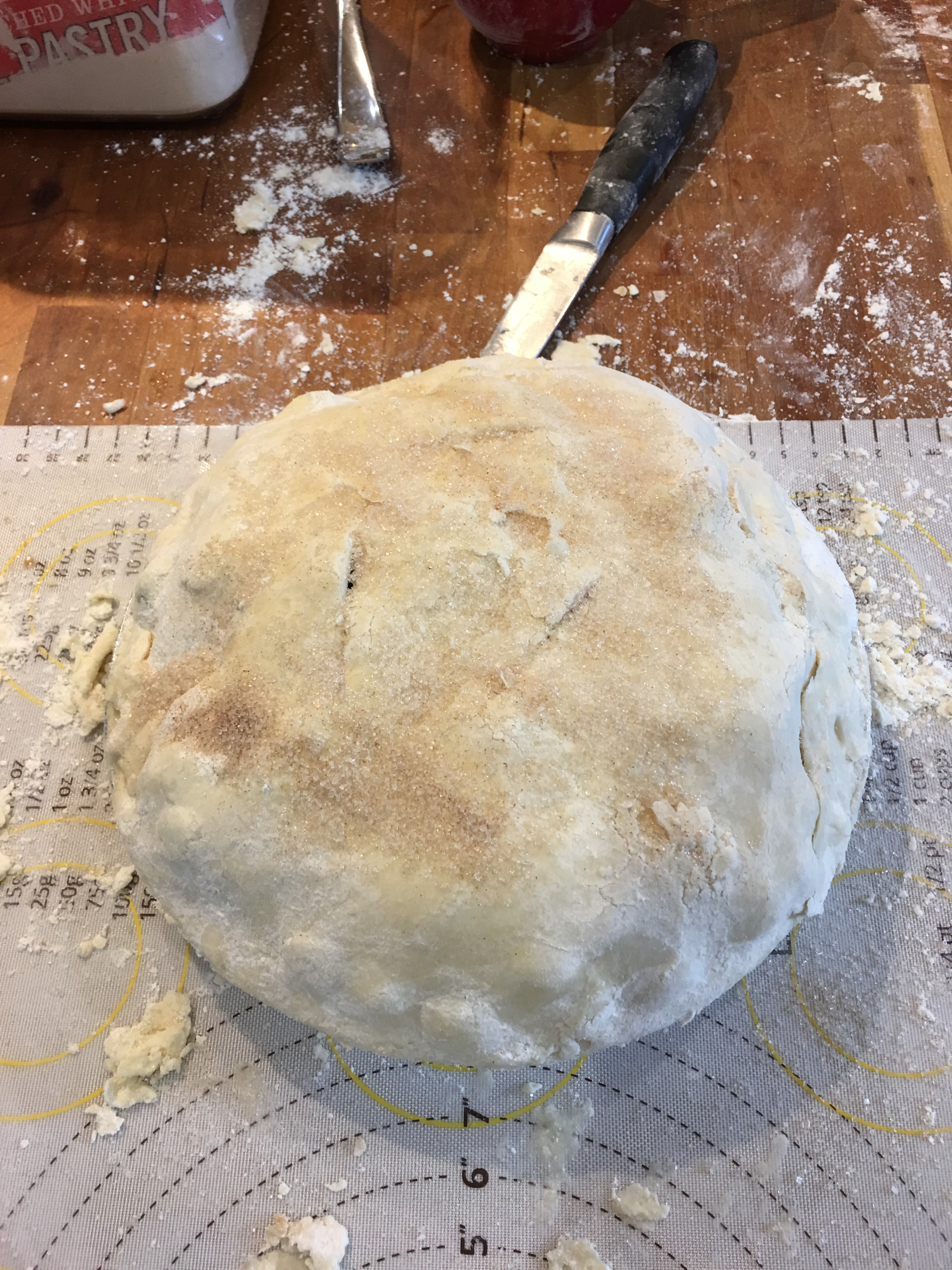 Eighth, don’t fret about an imperfect top crust. Use extra small pieces of crust to patch open areas. Sprinkle a sugar/cinnamon combination over the top of the crust (this not only adds a sweet crunch to the crust but also covers up imperfections).