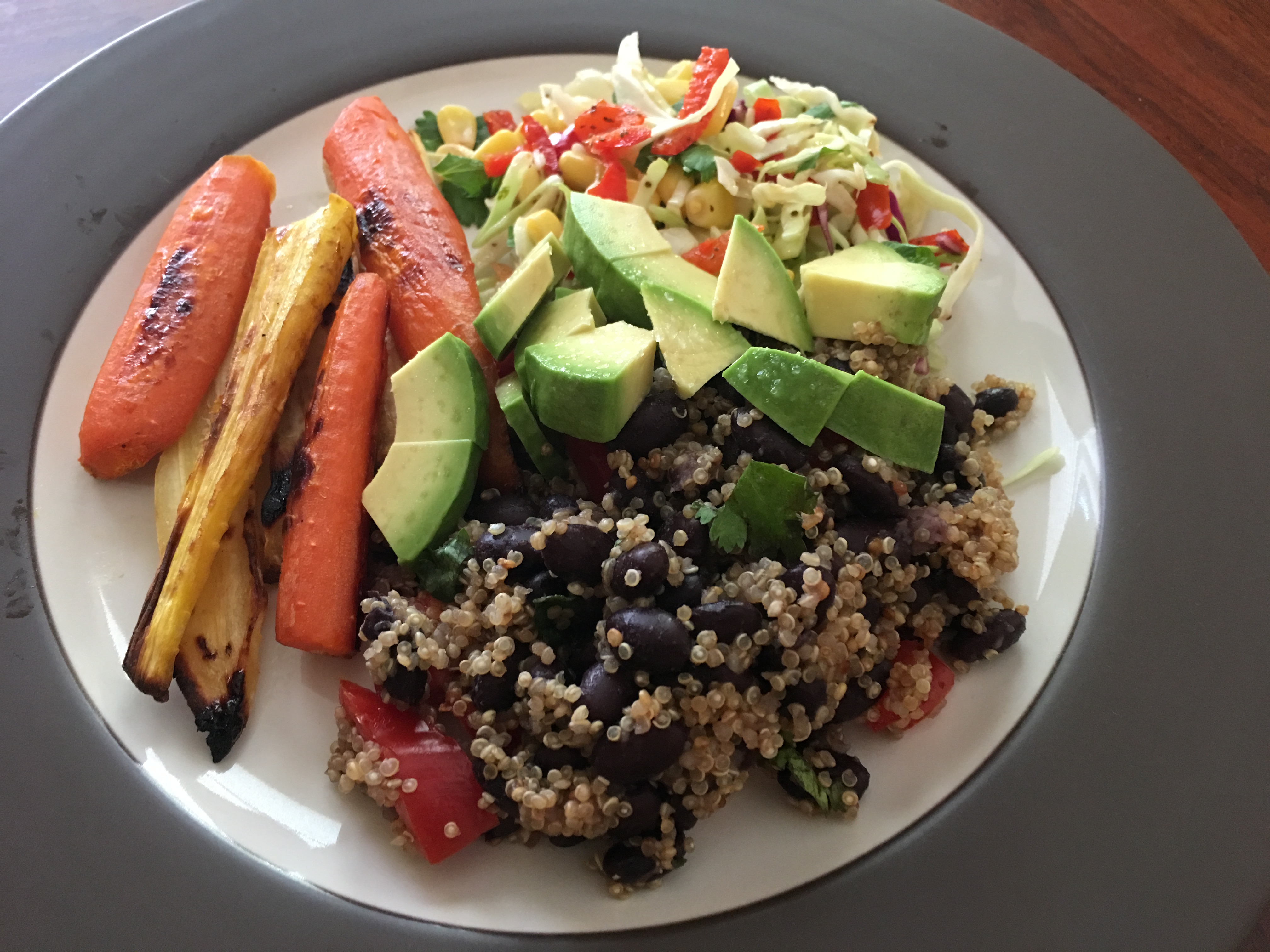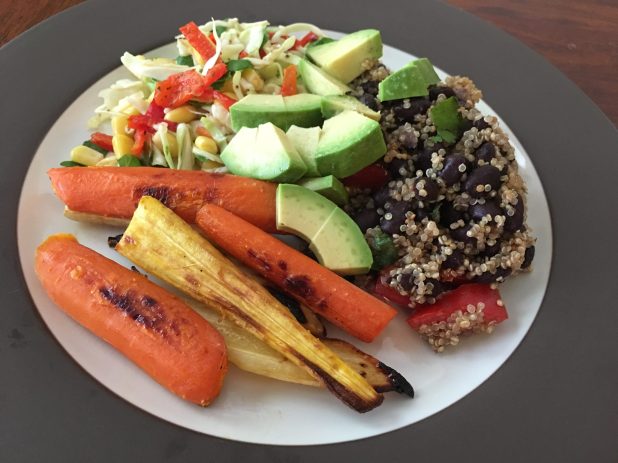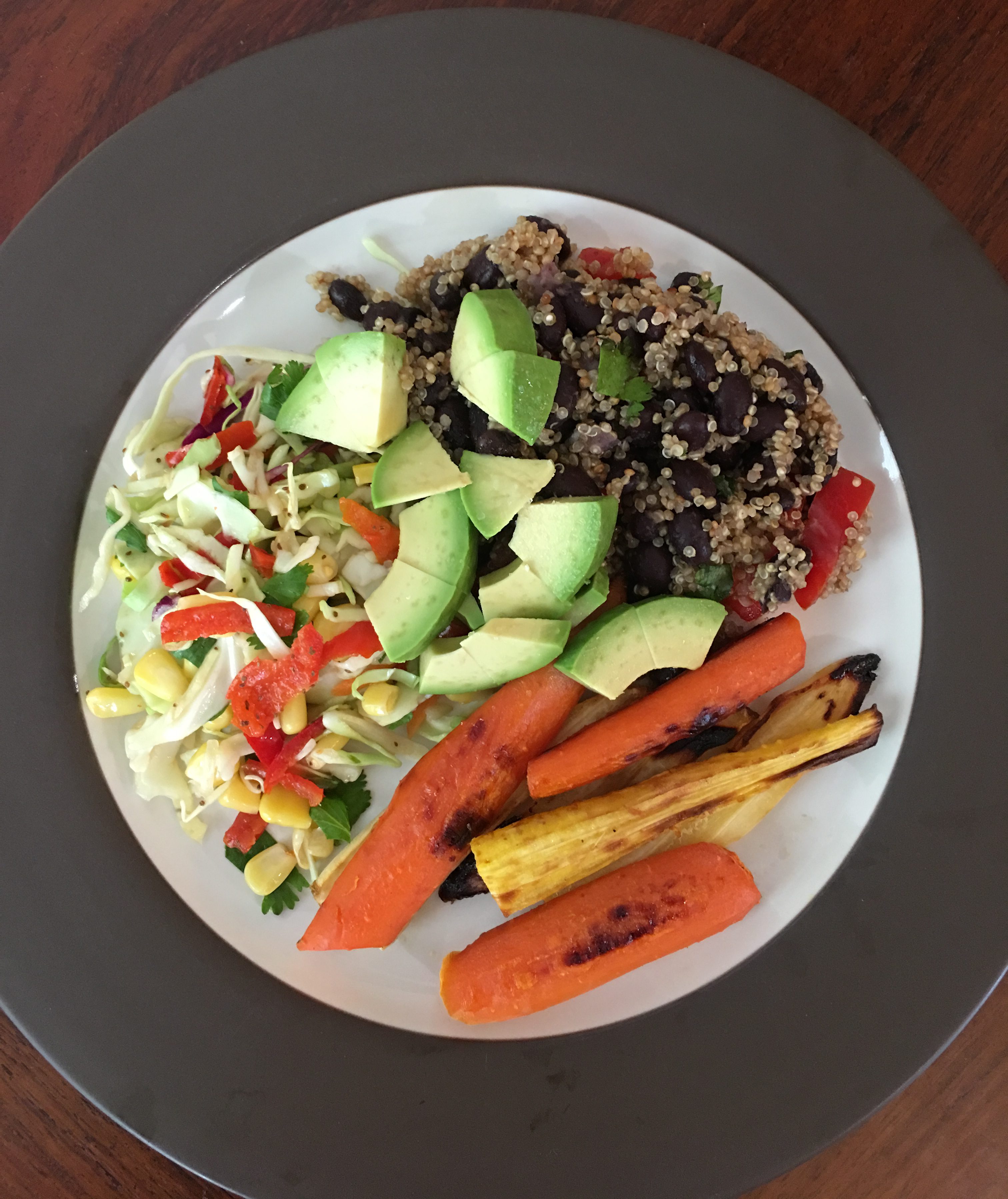 Confetti Slaw, Black Bean Quinoa Salad, and Roasted Carrots