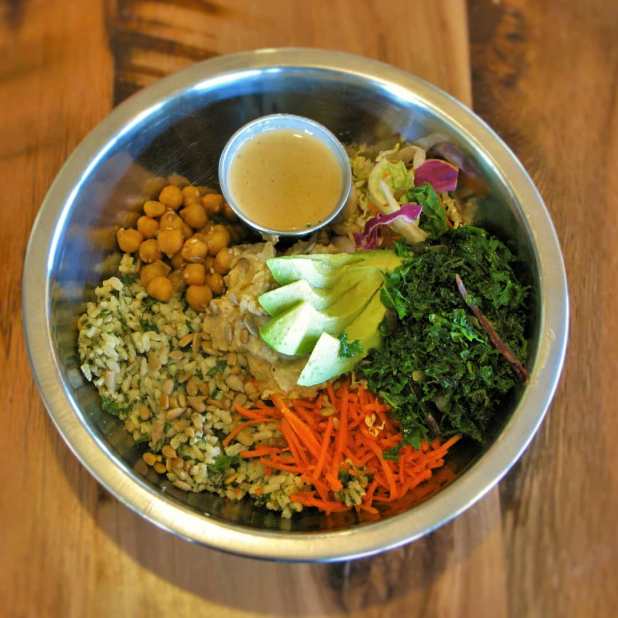 There’s also the very popular Green Beetle – a beet burger with all the fixins’ wrapped in a steamed collard green – or the Falafel Burger. Salads are plentiful with four vegan options (Kaleafornia, Citrus Kale, Chop Chop, and the Sagehouse). And, for those who want to enjoy a rice bowl, consider the Buddha Bowl: chick peas or regular or spicy hummus, brown rice tabbouleh, kale slaw, carrots, avocado, chick peas, cabbage, and sunflower seeds with a lemon tahini sauce.