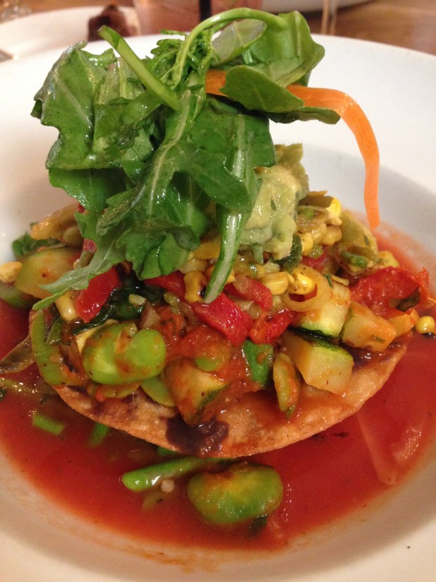 On another visit, the chef made an equally delicious entrée – asparagus, fava beans, corn, and onions in a light tomato sauce topped with a crispy tortilla that was covered in roasted vegetables and topped with fresh guacamole and greens. Spectacular presentation and totally delicious.