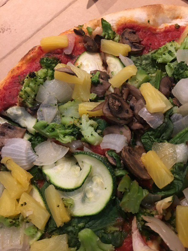My typical 14-inch pizza has fresh broccoli florets, fresh spinach leaves, freshly mandolin-sliced zucchini, mushrooms, onions, and pineapple but there are also olives, peppers, tomatoes, basil, sun dried tomatoes, artichoke hearts and fresh garlic that can be added.