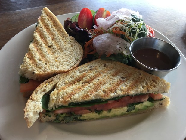 Try the granola bowl with fresh fruit and almond milk, the acai bowl without the honey, the Asian BBQ Tempeh Sandwich, the avocado toast, or my favorite, the Avo Melt – sliced avocado, tomato, spinach, and fresh basil on grilled multigrain bread – without the melt (goat cheese) with a side of green salad (instead of the potato chips) with the house balsamic vinaigrette.