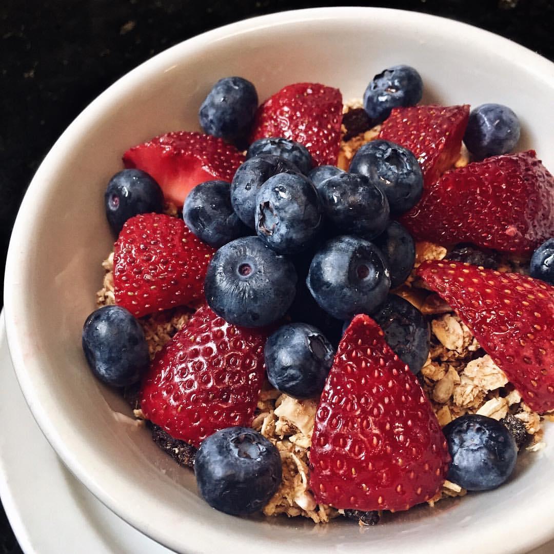 Try the granola bowl with fresh fruit and almond milk, the acai bowl without the honey, the Asian BBQ Tempeh Sandwich, the avocado toast, or my favorite, the Avo Melt – sliced avocado, tomato, spinach, and fresh basil on grilled multigrain bread – without the melt (goat cheese) with a side of green salad (instead of the potato chips) with the house balsamic vinaigrette.